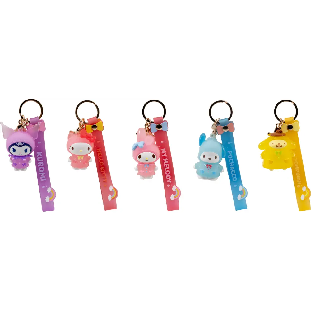 Brighten up rainy days with the Hello Kitty and Friends Keychain & Strap Raincoat Series 5Asst! This playful collection features Hello Kitty and her friends dressed in colorful raincoats, bringing charm and cheer to your everyday accessories. Each keychain and strap set showcases a unique character crafted with soft pastel tones and delightful details, perfect for attaching to keys, bags, or backpacks. Made from high-quality PVC and sturdy metal, these durable keychains combine kawaii style with lasting quality. With five assorted designs to collect, the Raincoat Series is a fun and adorable addition to any Hello Kitty fan’s collection.