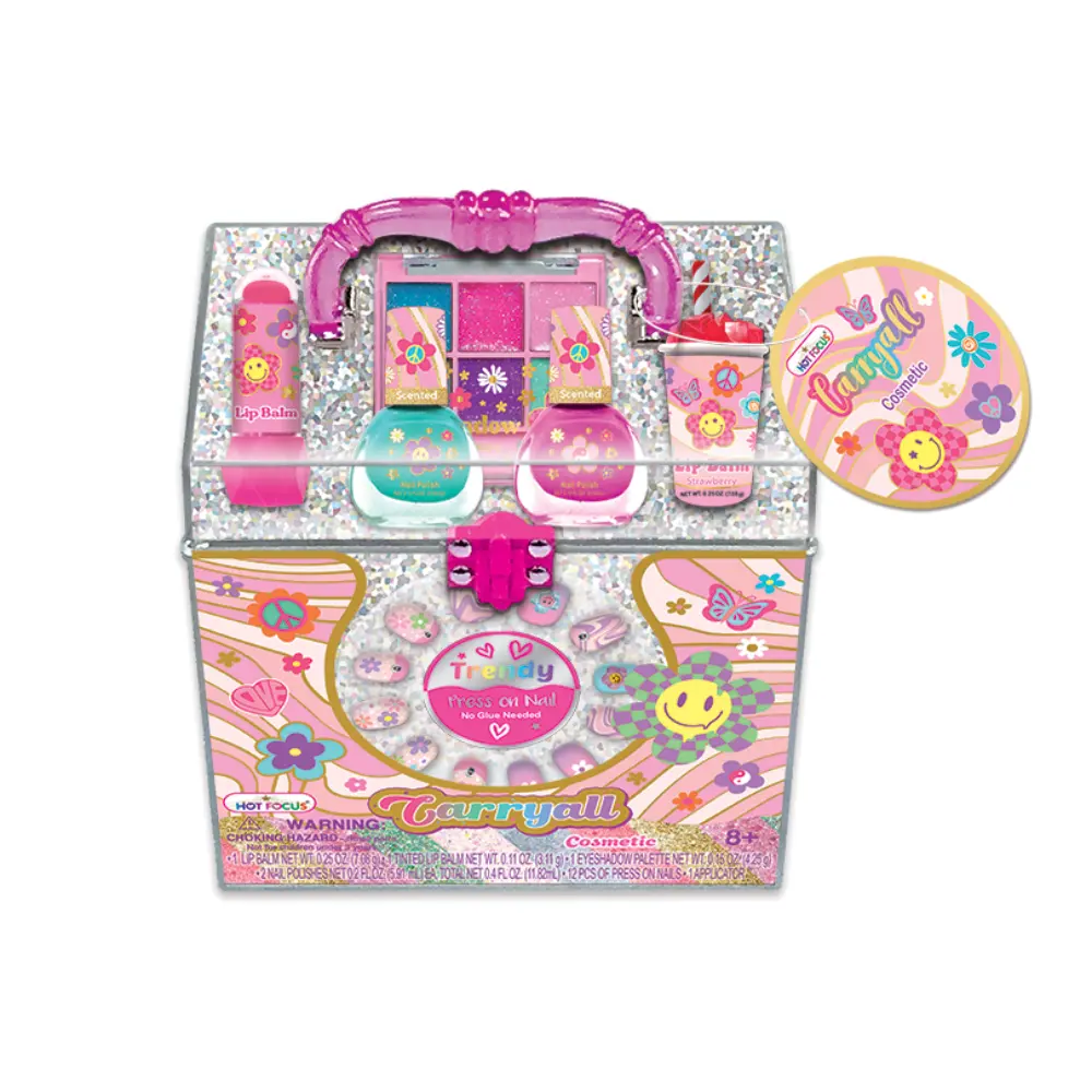 Unleash your creativity with the Hot Focus Unicorn Carryall Cosmetic Set, designed for imaginative individuals aged 8 and up. This vibrant beauty collection features a trendy unicorn pattern and comes in a sturdy, reusable acrylic case adorned with a colorful rainbow design. Inside, you’ll find everything needed to express your style, including nail polishes, lip balms, adhesive nails, and an eyeshadow palette with applicator. Perfect for aspiring makeup artists, this kit keeps your cosmetics neatly organized and ready for countless fun makeup sessions.