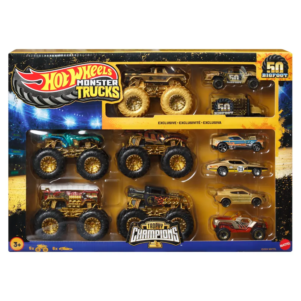 Celebrate 50 years of Bigfoot with the Hot Wheels Monster Trucks Bigfoot Trophy Champions Collection! This special multipack includes five fan-favorite Monster Trucks — Bigfoot, 5-Alarm, Bone Shaker, Tiger Shark, and Mega-Wrex — all in 1:64 scale with exclusive gold-colored deco accents to mark the milestone. It also comes with six die-cast cars for epic smash-and-crash action right out of the box. Packed in commemorative packaging, this set is perfect for collectors and kids aged 3 and up who want to relive Monster Trucks Live! moments or create brand-new adventures.