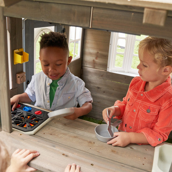 The Forestview II Playhouse by KidKraft is built to spark imaginative play in a beautiful house packed with fun and exciting possibilities. Kids will love playing outside for hours in this house full of realistic and exciting details like a working doorbell, a clock with moveable hands and double-sided chalkboard walls. Little ones will light up as they walk through the front door and enter the playhouse with decorative windows to see that there is an adorable play kitchen complete with two pans and a spatula hanging on cute little pegs. Featuring a large serving window with a moveable bench and two planter boxes, the Forestview II Playhouse by KidKraft creates the ultimate fun destination for kids. Built with premium wood and treated with a child-friendly water-based stain, the Forestview II Playhouse by KidKraft is made with high-quality materials and designed to be aesthetically pleasing so little ones can have big fun in their backyard for years to come. With EZ Kraft Assembly™, spend less time assembling and enjoy more time playing!.