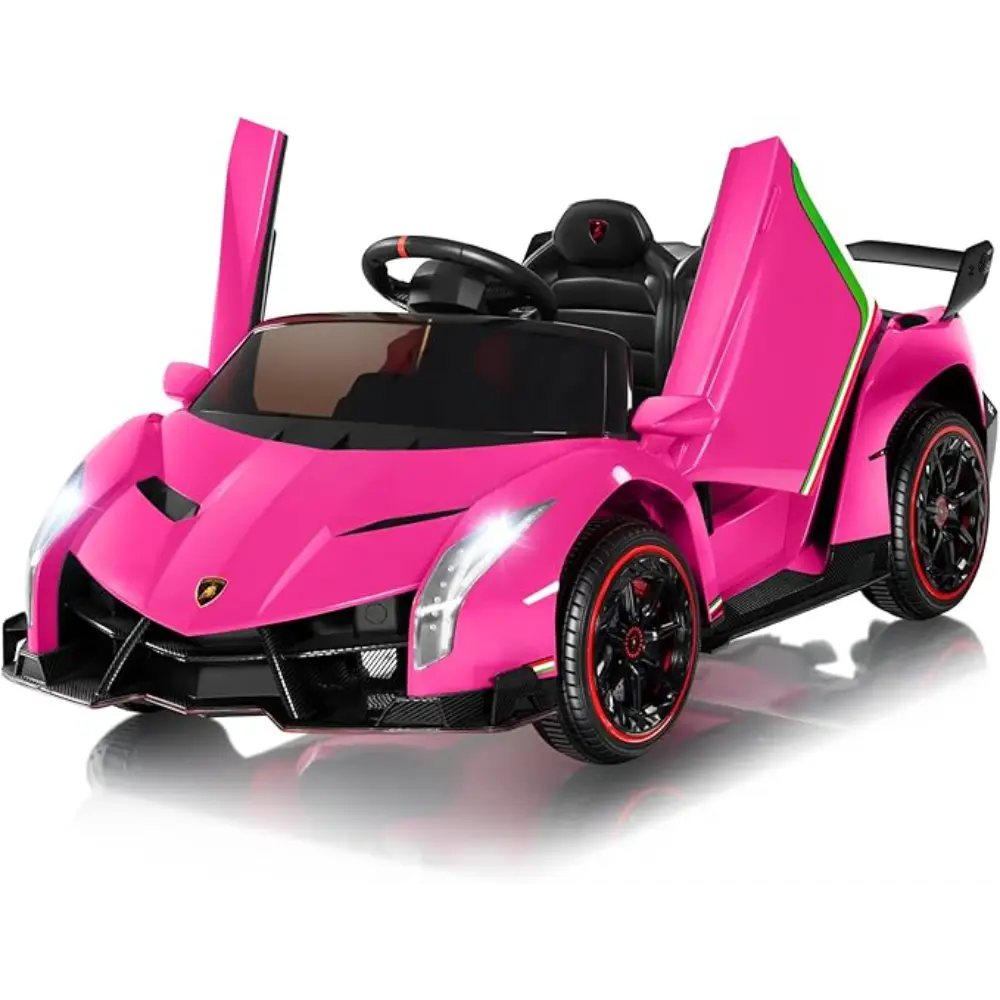 licensed Lamborghini Veneno is designed with double openable doors with Hydraulic Rods, bright LED lights, operated handle and foot pedal, which is mimicked from the real Lamborghini Veneno to provide realistic driving experience. This electric toy car can be operated by both children and parents. Pedals and steering wheel is one way for children to drive the car, and using parental remote is the other way. Note that 2 x 1.5V AAA batteries are not included. The 12V remote control toddler car has wheels spring suspension, and a slow start function with 2-point seat belt to make sure a safe playtime on almost any terrains. Solid PP cover makes the remote control toddler car a lasting delight with a maximum weight of 66 lbs. Featuring with built-in music, this 12V rid-on car manages to bring more joy to kids. USB and MP3 port means to connect other music devices for more audio options for kids’ preference.