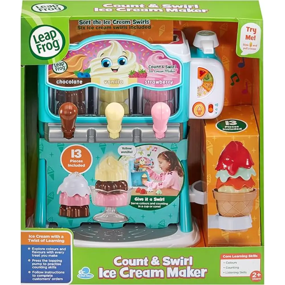 Bring the sweet fun of ice cream to playtime with the LeapFrog Count & Swirl Ice Cream Maker! This interactive role-play toy lets children serve chocolate, vanilla, and strawberry ice cream swirls while taking pretend customer orders to practice listening and social skills. Kids can choose a cone or cup, pull the levers to dispense flavors, and top their creations with whipped cream, caramel, cherry, or mint sauces. With 12 pretend accessories and hands-on engagement, this ice cream maker encourages creativity, fine motor development, and imaginative play for preschoolers.