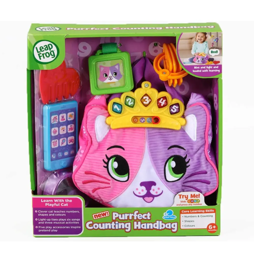 Meet the Purrfect Counting Handbag, featuring a clever and playful cat that brings learning, pretend play, and music together in one interactive toy. This soft, multi-textured handbag includes five fun accessories—ID badge with mirror, phone, keys, comb, and coin purse rattle—to encourage fine motor skills and imaginative play. With Learning, Pretend, and Music modes, children can explore numbers, counting, colors, shapes, and playful melodies by pressing the light-up jewels on the interactive tiara. Designed for babies 6 months and up, this handbag makes learning and playtime delightfully engaging.