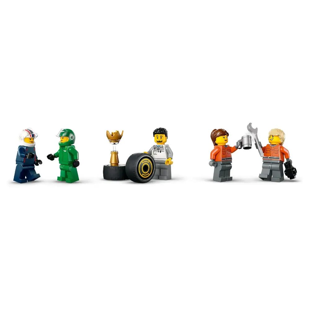 - Includes 2 driver minifigures, 3 race crew figures, and a trophy