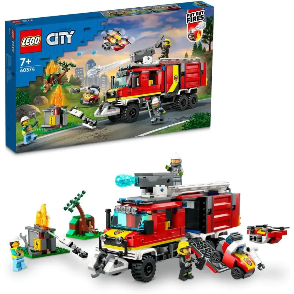 Add a spark to kids firefighting play with the LEGO® City Fire Command Truck (60374). This feature-rich toy fire engine comes with a detachable control center, fire drone and land drone. Kids can launch different elements from the truck and fire drone to depict water and foam firefighting action. Just add the forest and city fire settings and 3 minifigures for hours of action-packed firefighting fun! Build-and-play fun for kids aged 7 and up. This LEGO construction set includes a step-by-step printed building guide and the LEGO Builder app – an interactive building guide with intuitive zoom and rotate tools that allow kids to visualize each model from all angles as they build. Toys that nurture kids creativity. LEGO City playsets take kids to the heart of the action, where they decide the stories, with feature-rich buildings, realistic vehicles and fun characters that inspire imaginative, open-ended role play.