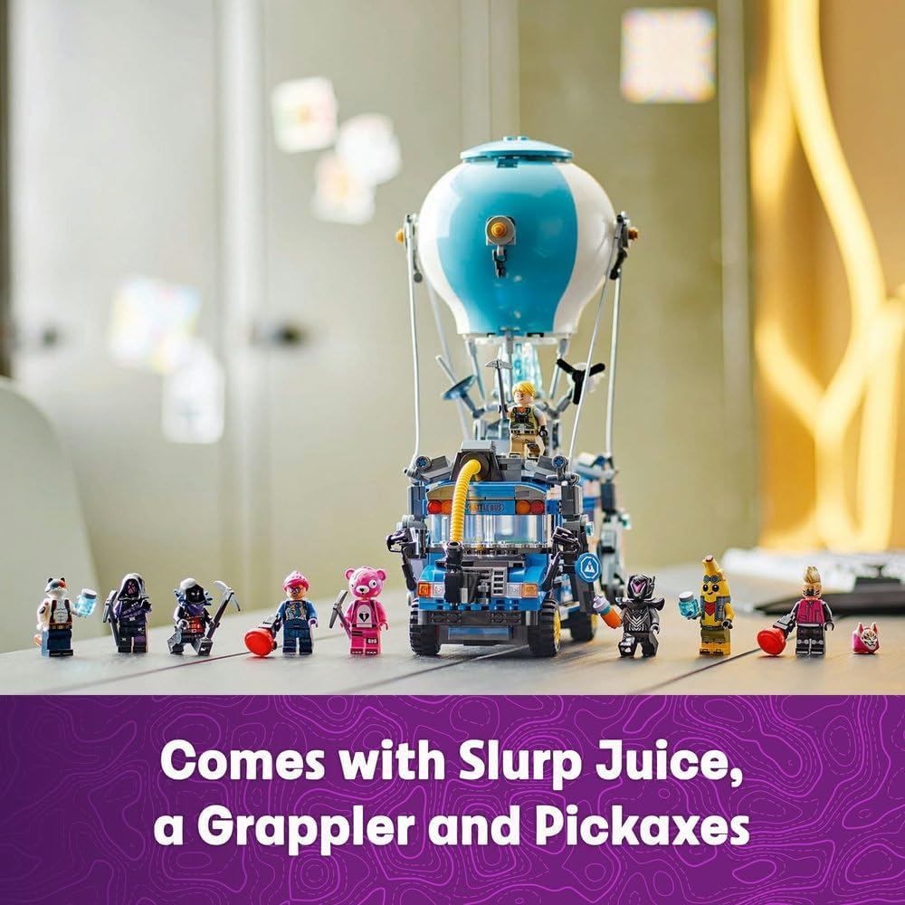 Bring the action of the Fortnite universe to life with the LEGO Fortnite Battle Bus (77073) building set, designed for fans aged 10 and up. This exciting set lets gamers build a brick version of the iconic Battle Bus, complete with rolling wheels, a removable roof, and its instantly recognizable hot-air balloon. Once assembled, the bus becomes the centerpiece for creative role play with 9 minifigures representing popular Fortnite outfits, including Battalion Brawler, Adventure Peely, Brite Bomber, Cuddle Team Leader, Cube Assassin, Trespasser Elite, Drift, Meowscles, and Raven.