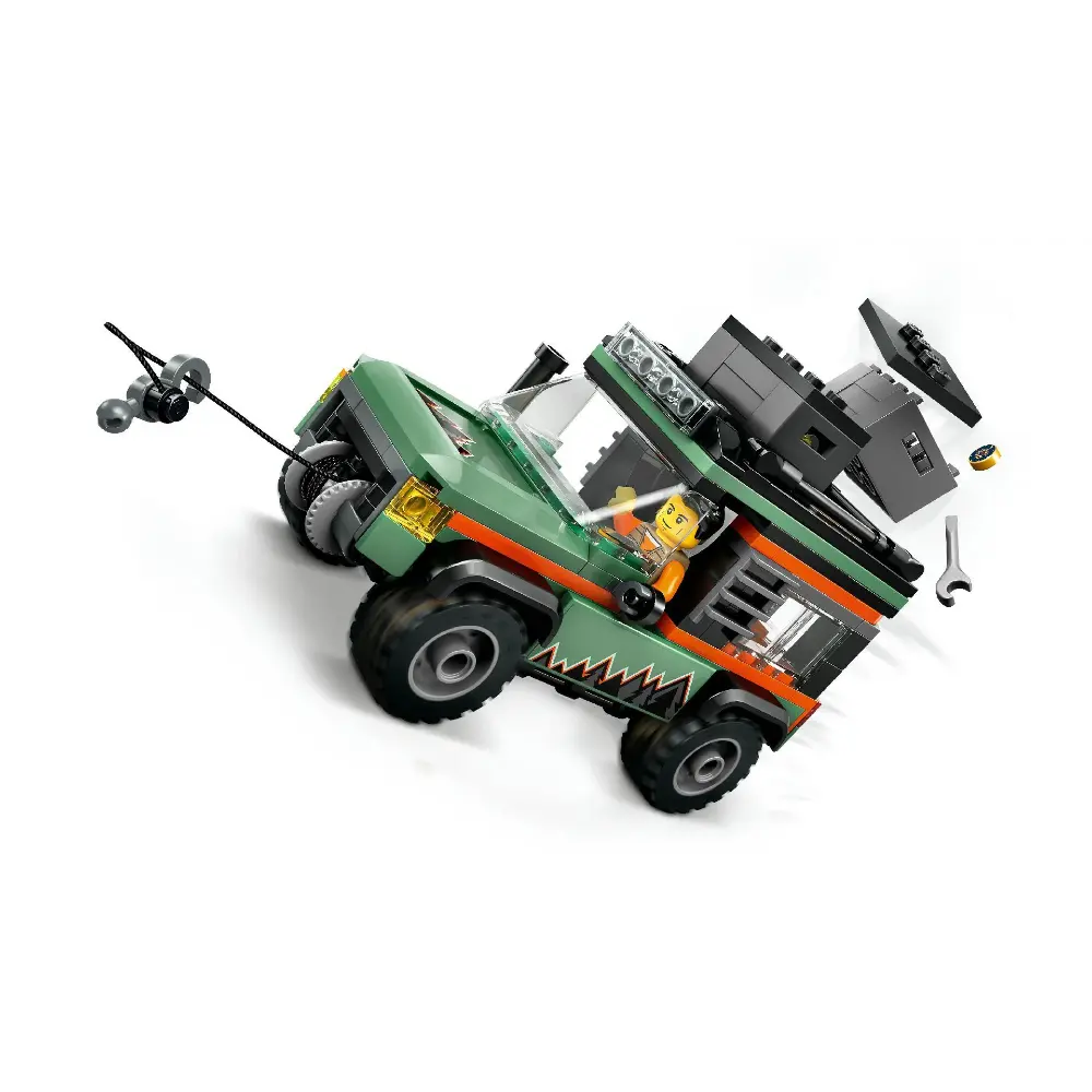 - Includes a 4x4 mountain truck with roof storage, rugged tires, tools, and working winch