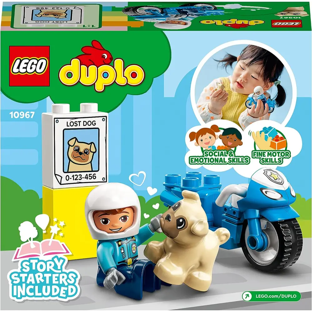 LEGO® DUPLO® Rescue Police Motorcycle (10967) provides hands-on developmental play that will delight any preschooler aged 2+ with an interest in police work, cool motorcycles and caring for animals. A police rescue with endless play possibilities. A cute dog has gone missing! Can your little hero help the police officer find the lost pet? There is a Lost Dog poster to put up and an exciting mission to complete. Where is the dog hiding this time? With a cute animal to care for and a friendly policeman on a push-along motorcycle, this versatile playset will strengthen preschoolers social, emotional and fine motor skills as they play out the real-life adventures of an everyday hero.