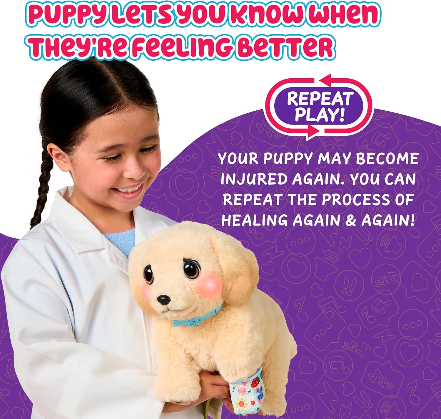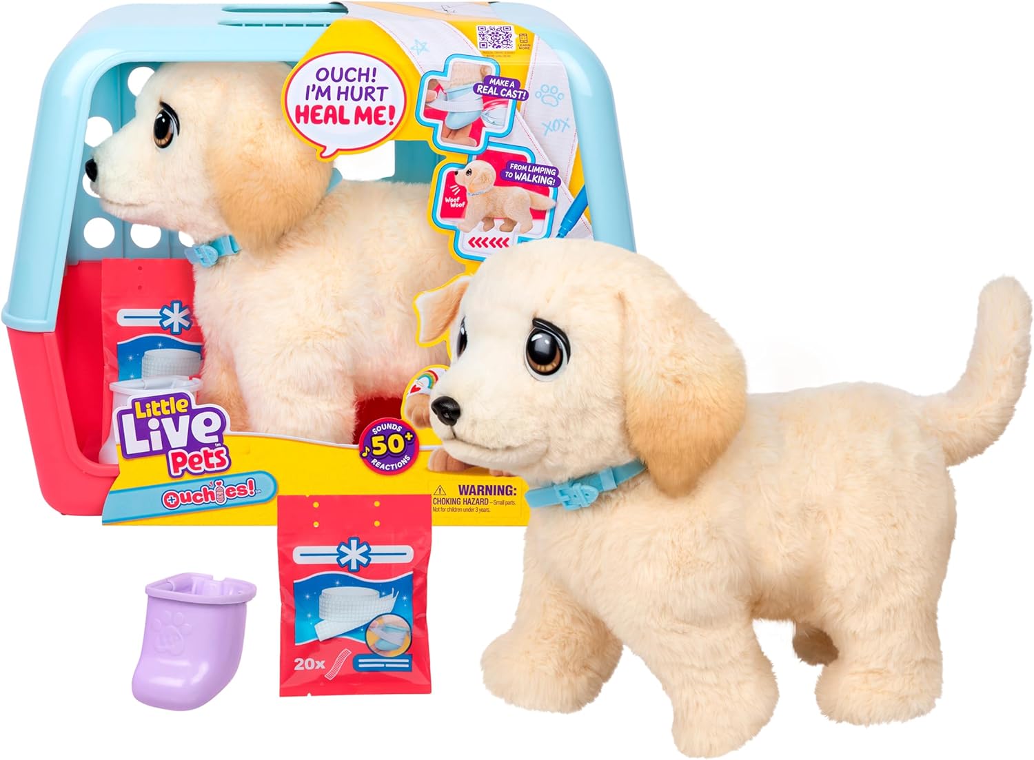 Meet Little Live Pets Ouchies – the interactive injured puppy who needs your love and care! With over 50 sounds and reactions, Ouchies is full of lifelike responses that make playtime feel real. Help your poor pup feel better by wrapping a cast, giving gentle pets, and showering him with kisses. As you care for him, watch Ouchies transform from limping and sad to happy, walking, and healed! When it’s time for a vet checkup, use the included puppy carrier that cleverly turns into a vet tray. Once Ouchies is all better, take him for a walk and enjoy endless cuddles!
