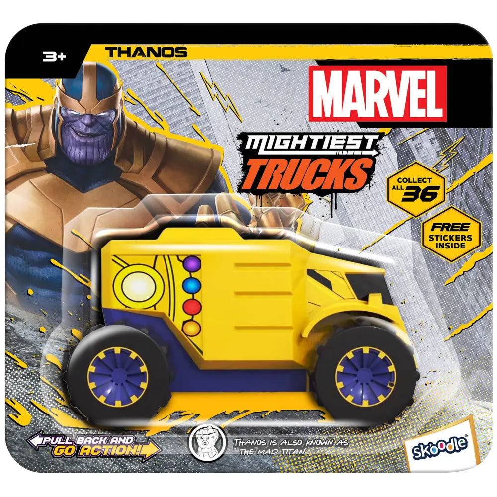 ]Dynamic and entertaining, our pull-back Marvel Monster Truck promise high-speed fun at your fingertips. Simply pull them back, release, and watch as they zoom forward, thrilling both kids and adults with their speedy antics. Compact, colourful, and built for excitement, these Marvel Monster Truck are a must-have for endless playtime joy. Your Thanos figure will be way too fast for his enemies to handle on this incredible crime-fighting.
