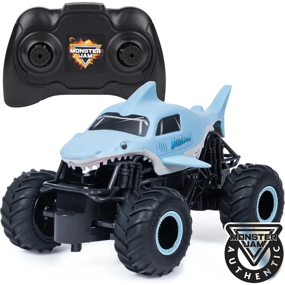 From the depths of the prehistoric ocean rises the all-new, official Monster Jam 1:24 scale Megalodon RC! This powerful predator lashes about to perform epic stunts, crazy crashes and brutal bashes! Featuring 2.4 GHz, you can race up to 6 Monster Jam trucks at a time! Now it’s even easier to host your own high-flying Monster Jam rally with your friends! And with a range of up to 250 ft., this prehistoric shark can travel farther in search of puny prey to pulverize! Nothing will stop it from domi