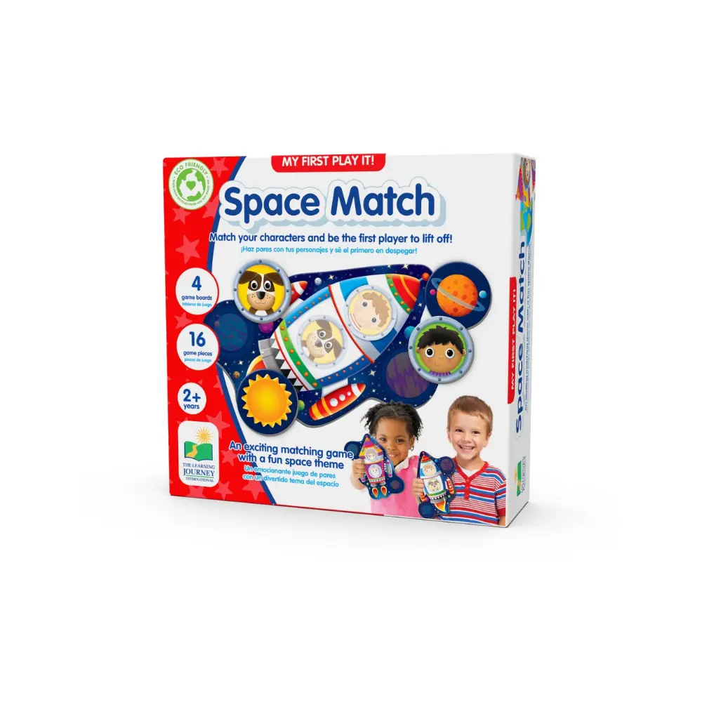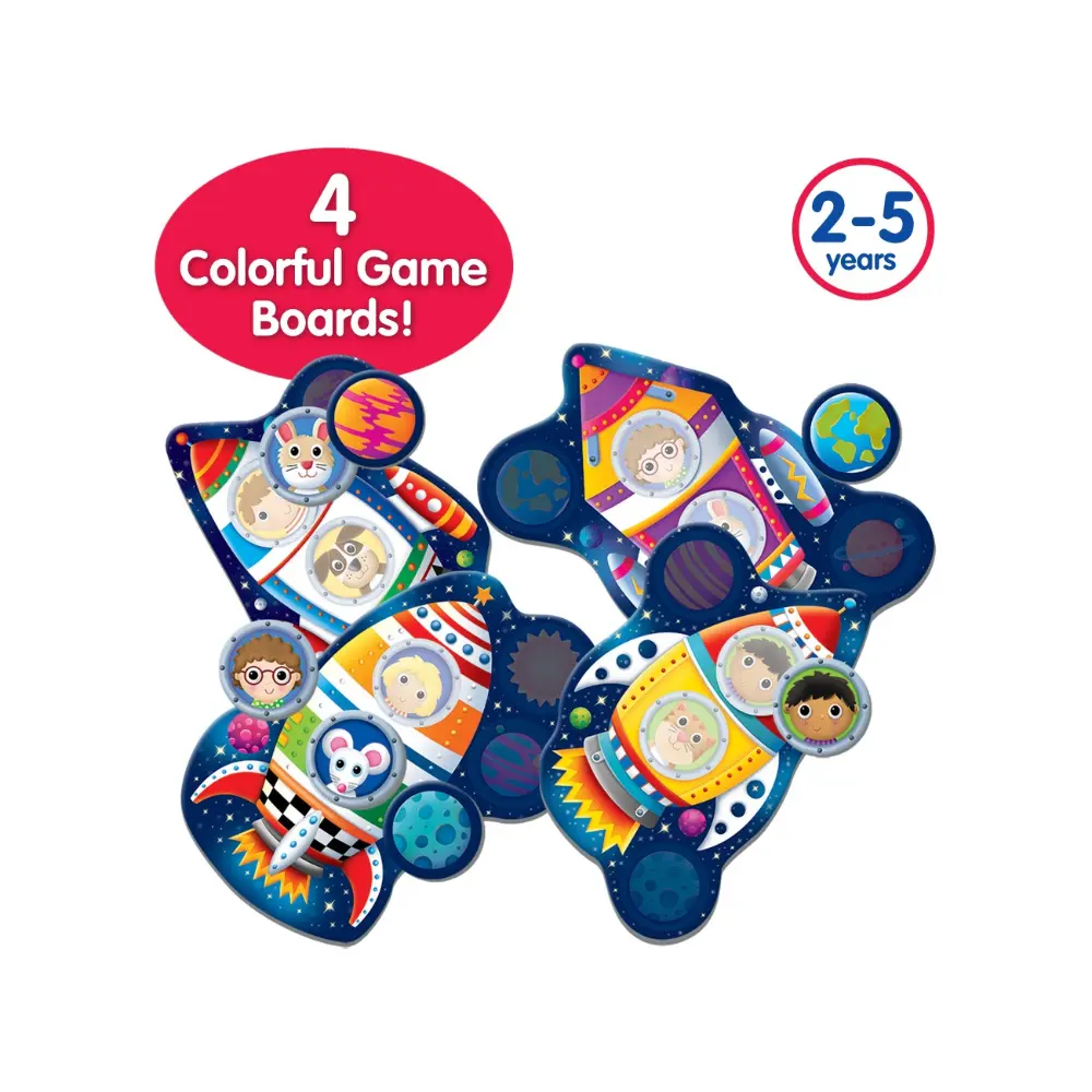 Blast off into fun and learning with My First Play It! Space Match! This adorable matching game helps little ones build memory and recognition skills while exploring a colorful outer-space theme. Players take turns picking cards and matching them to the cheerful characters on their rocket boards. The first to fill their board wins! Designed for young children, this easy-to-learn game encourages turn-taking, focus, and early learning skills.