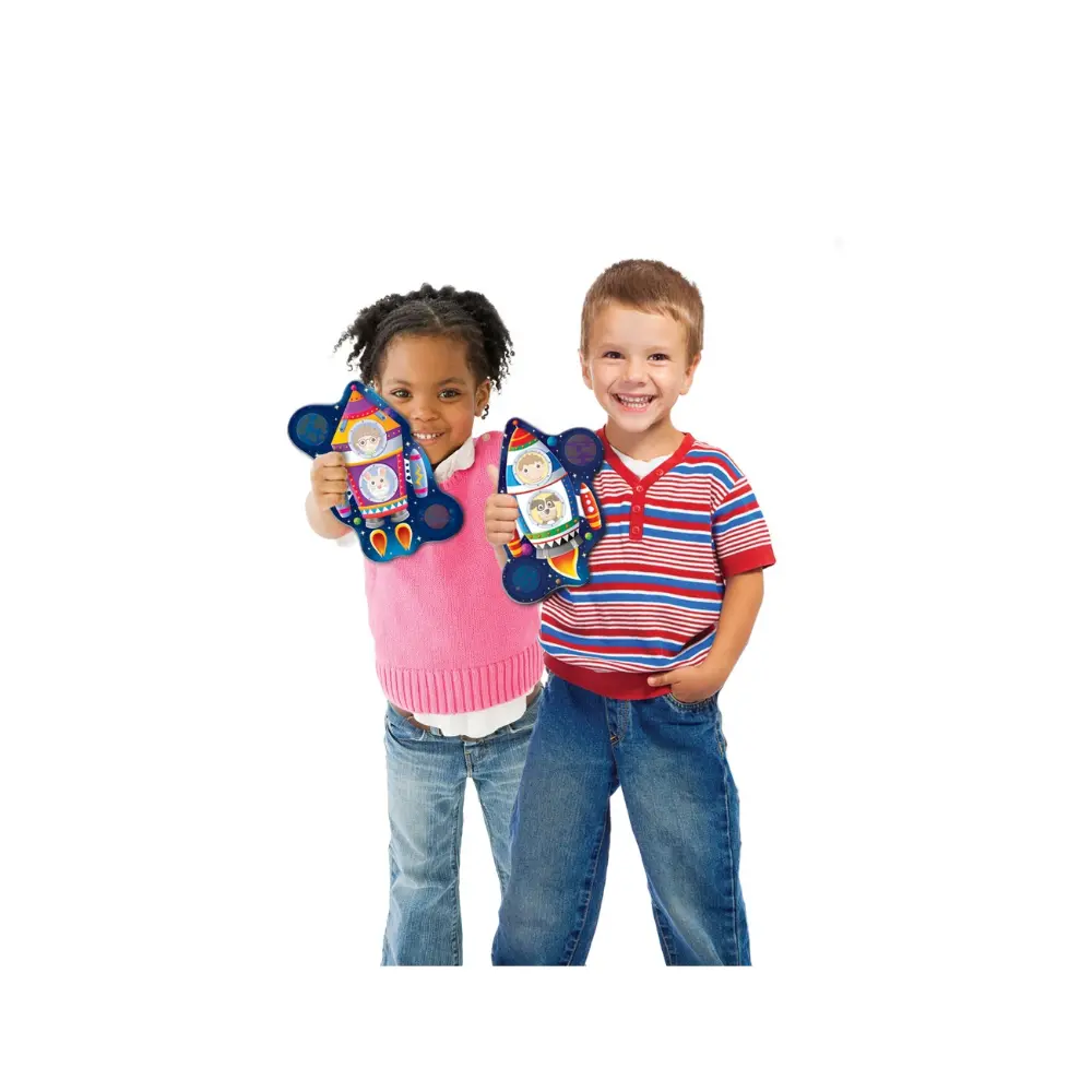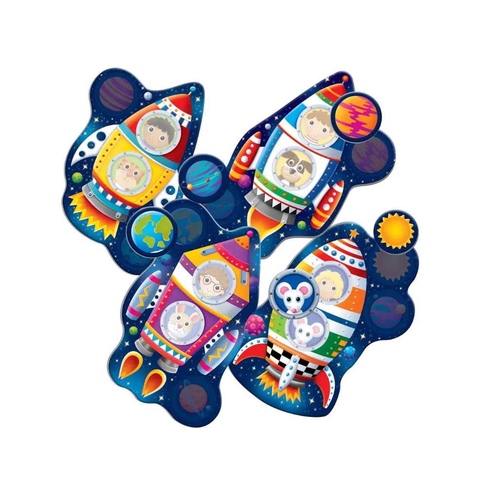 - Includes 4 bright rocket-shaped game boards and 16 character cards