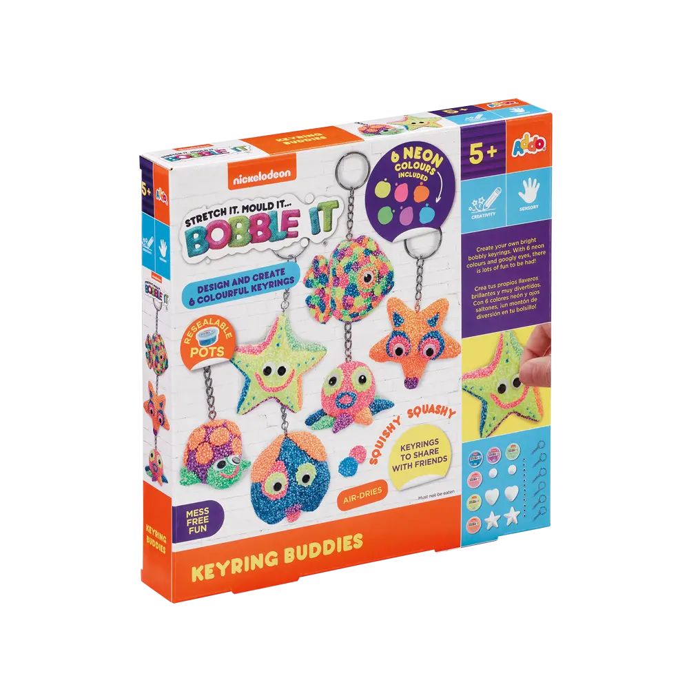 Stretch it, mould it, Bobble It! Get creative on the go with the Bobble It Keyring Buddies Craft Set. Use 6 vibrant neon colours to design and decorate fun, bobbly keyrings, then add googly eyes for extra personality. Once complete, attach to your bag, keys, or zippers for a playful accessory.