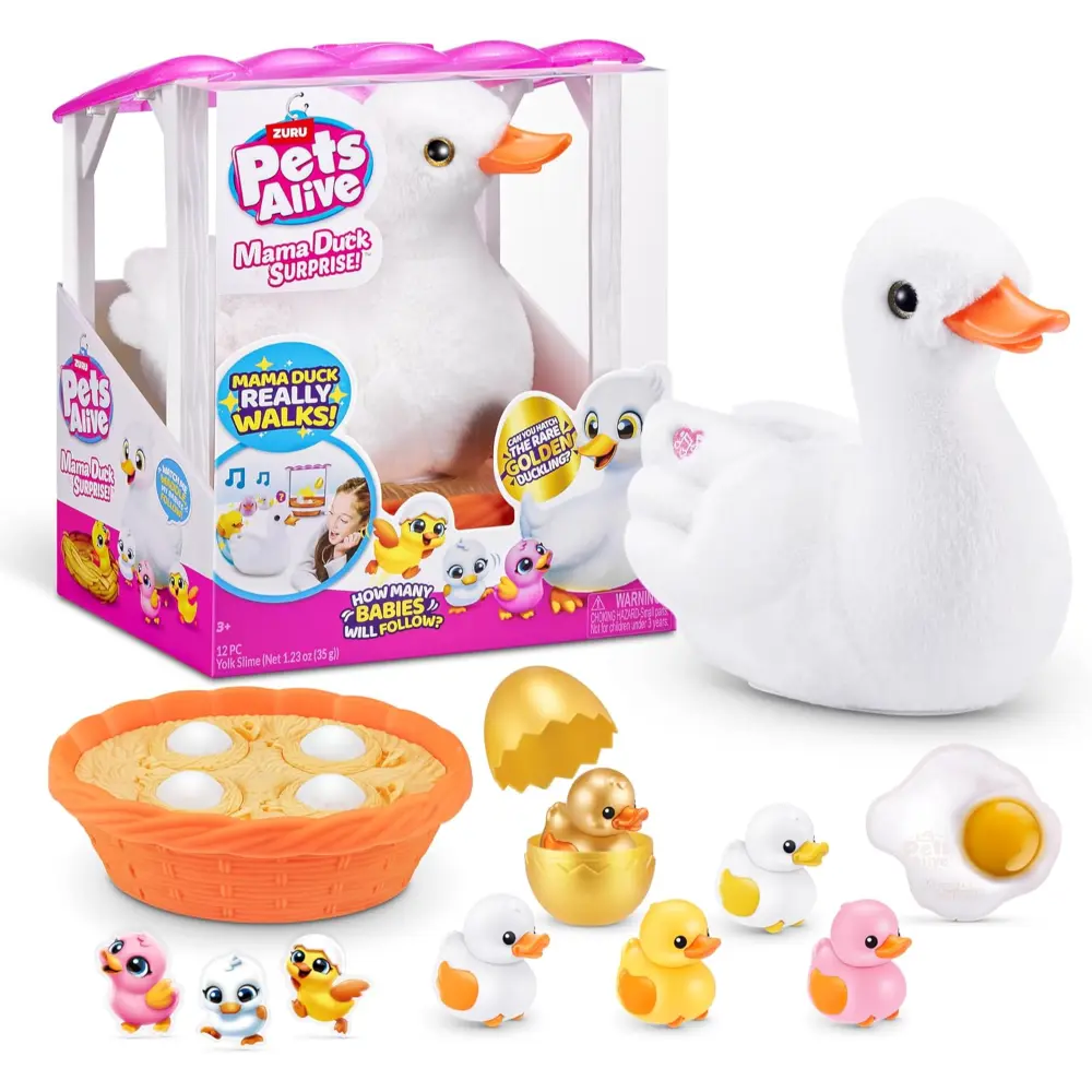Quack quack quack. It's hatching day and these ducklings are ready to play! Your Mama Duck is ready to hatch her own family! How many baby ducklings will she hatch? 2, 3 or 4? You might find the surprise yolk slime or cute stickers hidden in your egg! Mama Duck is full of surprises and loves to take her baby ducklings everywhere. Watch them follow as Mama Duck quacks and waddles. Will you be a lucky ducky and find the rare golden duckling? 1x Mama Duck Interactive Plush, 4x Surprise eggs with 2