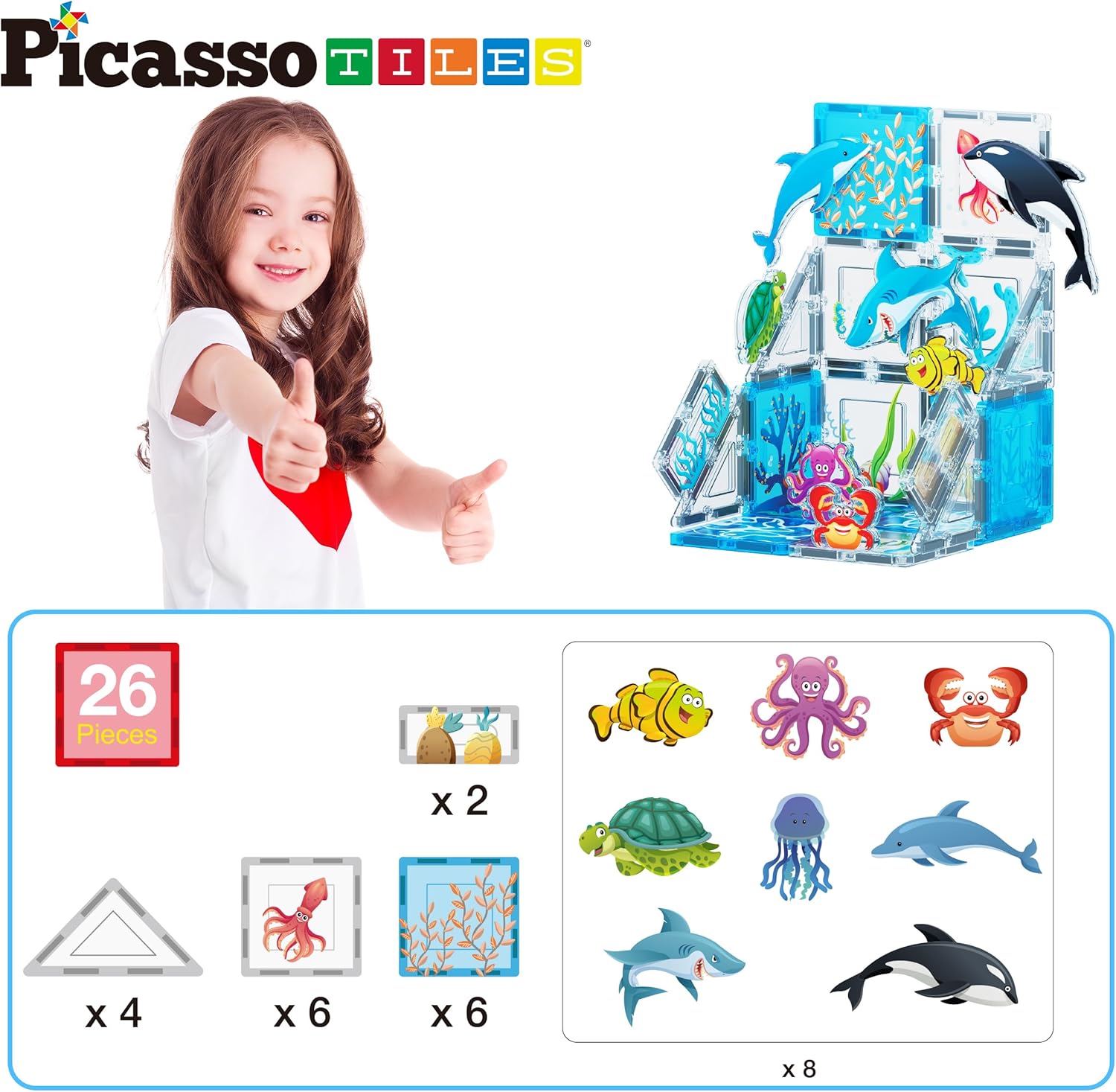 Dive into a world of underwater fun with the PicassoTiles Magnetic Tiles Aquarium Set. With 26 colorful magnetic tiles, children can build creative aquariums, explore imaginative marine scenes, and bring their ocean adventures to life. Perfect for hands-on STEM learning, this set encourages creativity, problem-solving, and fine motor skill development.