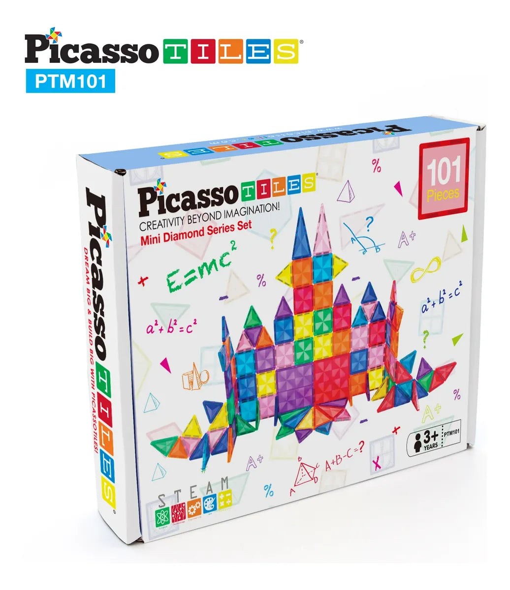 The PicassoTiles 101-piece magnetic tiles travel set (SKU: PTM101) features compact tiles with a unique diamond-shaped surface, perfect for creativity at home or on the go. This mini-sized building set can be used on its own or combined with other PicassoTiles Mini Series magnet sets to expand play possibilities. With strong magnetic connections and durable, child-safe materials, kids can design, build, and explore endless structures while developing spatial awareness, STEM skills, and imaginative thinking.