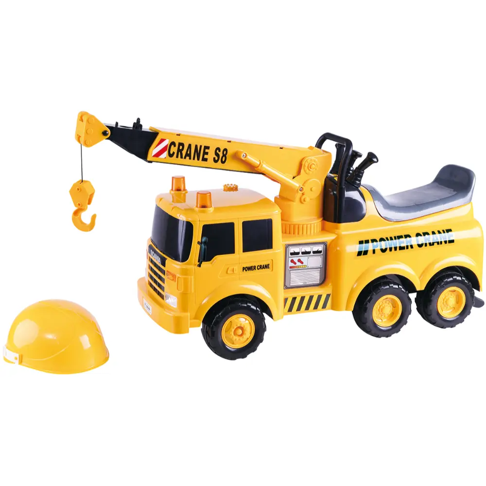 Flashing top light and head light. Heavy machinery sound. Stick control turning the boom left & right, hoisting hook. move up and down, heavy machinery sound. Turn on the yellow flashing light and start your busy day! Use the control stick to move the crane in all directions and get the job done! Comes with a hard hat. Flexible arm and free wheeling action for realistic play!