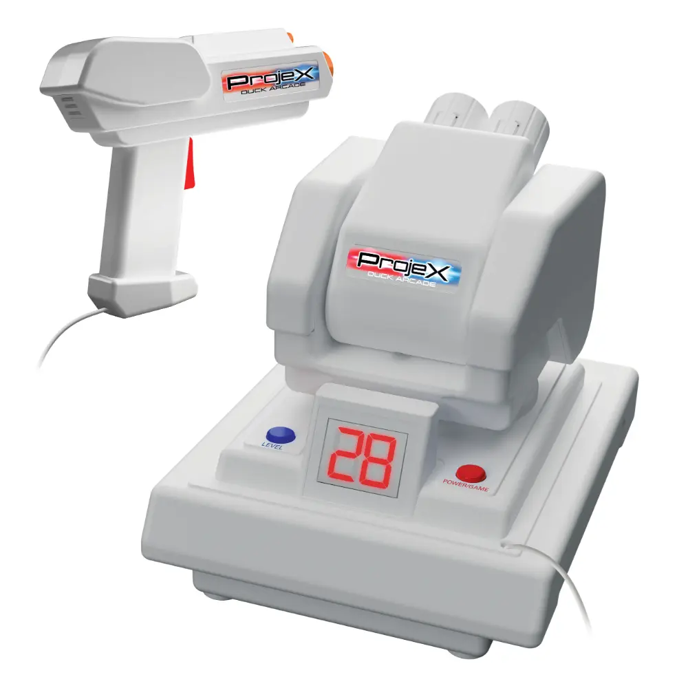 When it is lights off, its game on with the ProjeX Duck Arcade Game. No TV screens or sensors necessary. Just point ProjeX at a blank wall, grab the blaster, aim, and blast the targets! ProjeX lets you test your speed and skill as you blast the moving animated duck targets that it projects right onto your wall! There are three different built-in games and 3 skill levels from beginner to advanced and expert.
