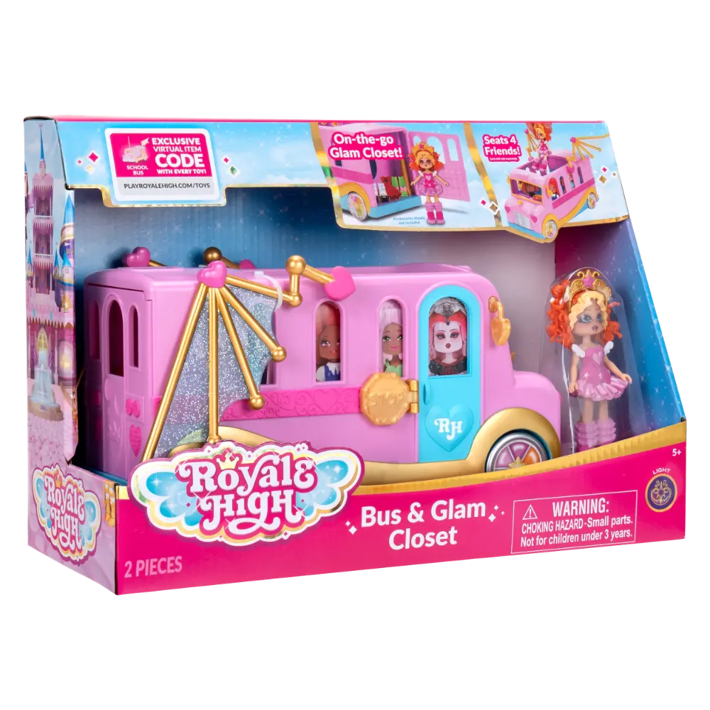 Step into the virtual world of Royale High and discover the Bus & Glam Closet playset! This fantastic set is perfect for your dolls fashion needs. It can accommodate up to four friends (each doll sold separately) and opens to reveal an incredible closet! Take a glamorous ride around town with your exclusive 3-inch doll and redeem your game code to receive a school bus in your Royale High virtual world. This playset is suitable for ages 5 and up.