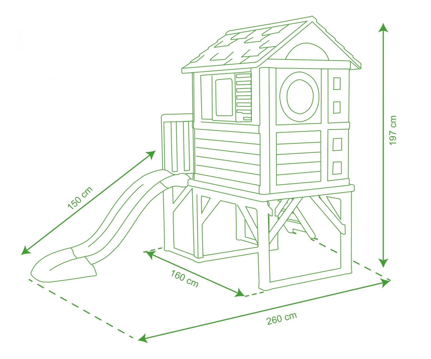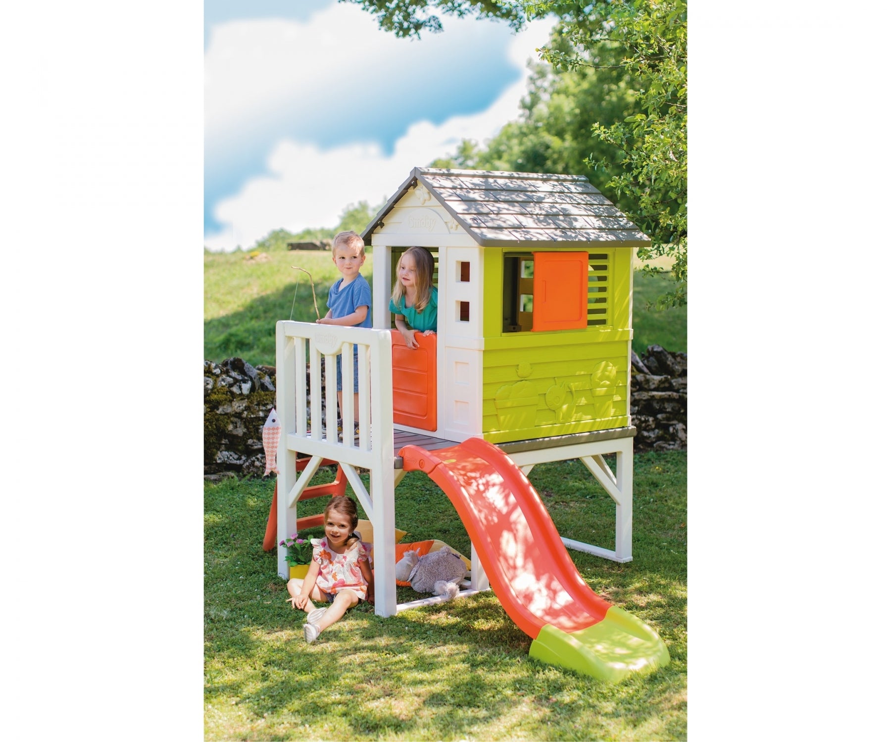 This charming playhouse stands on sturdy stilts and combines fun with practicality. Featuring a veranda, ladder, and 1.5 m slide with a wide run-out for a safe landing, it’s perfect for gardens, patios, or even bedrooms. Two windows with sliding shutters, a porthole window, and a half entrance door add rustic charm. Lightweight and easy to clean, this playhouse assembles quickly.