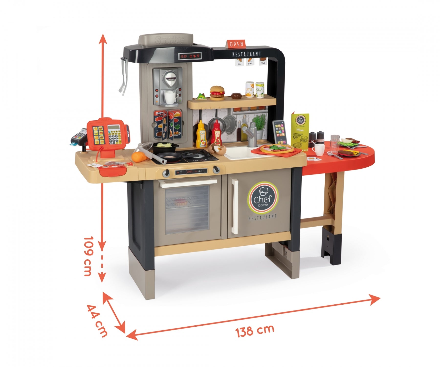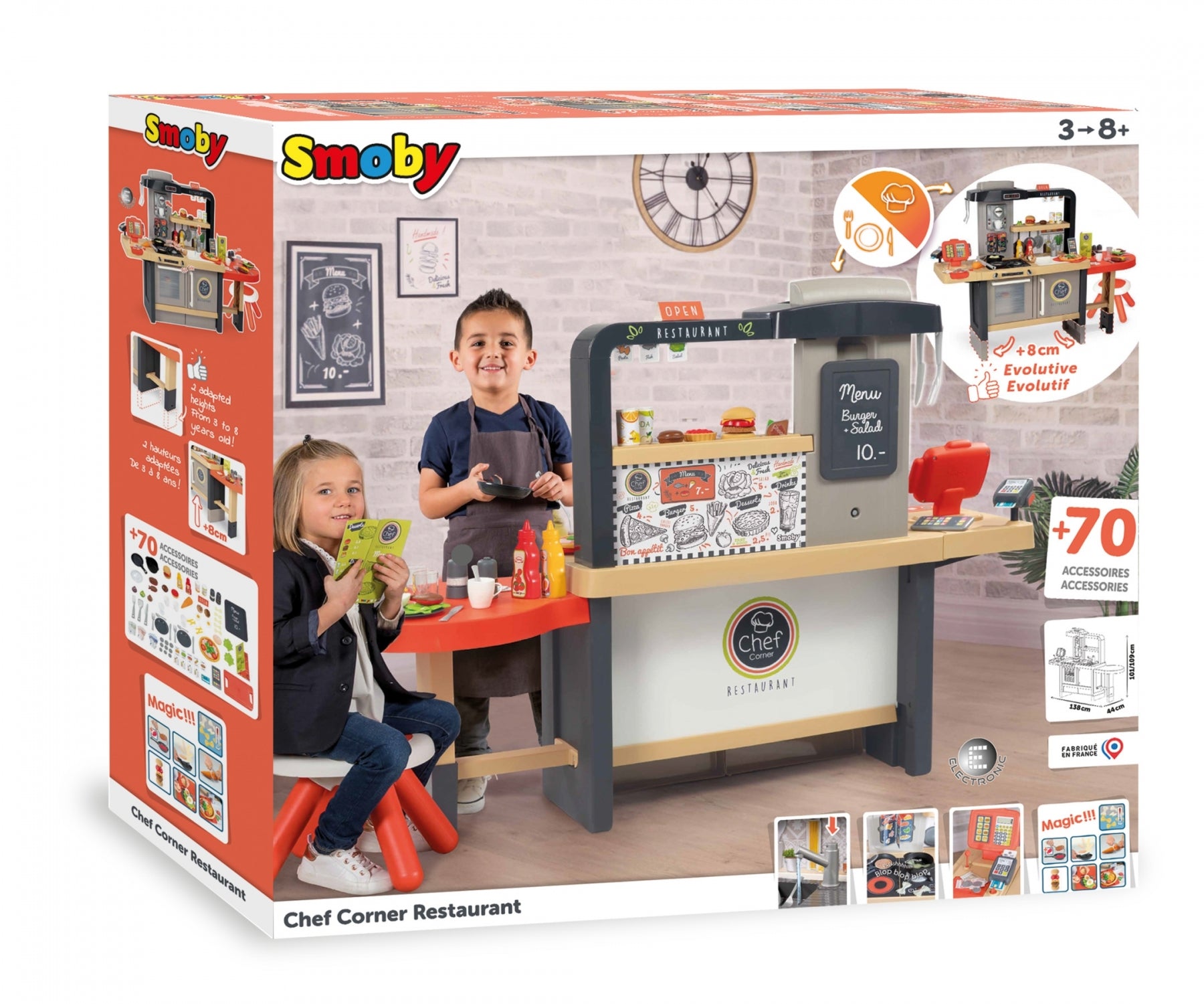 Enter the world of catering with the Smoby Evolutive Restaurant Playset! This imaginative 2-in-1 playset features separate kitchen and dining areas, allowing children to role-play as both chef and customer. Designed to grow with your child, the removable skirting boards increase the height by 8 cm, ensuring comfortable play as they get older.