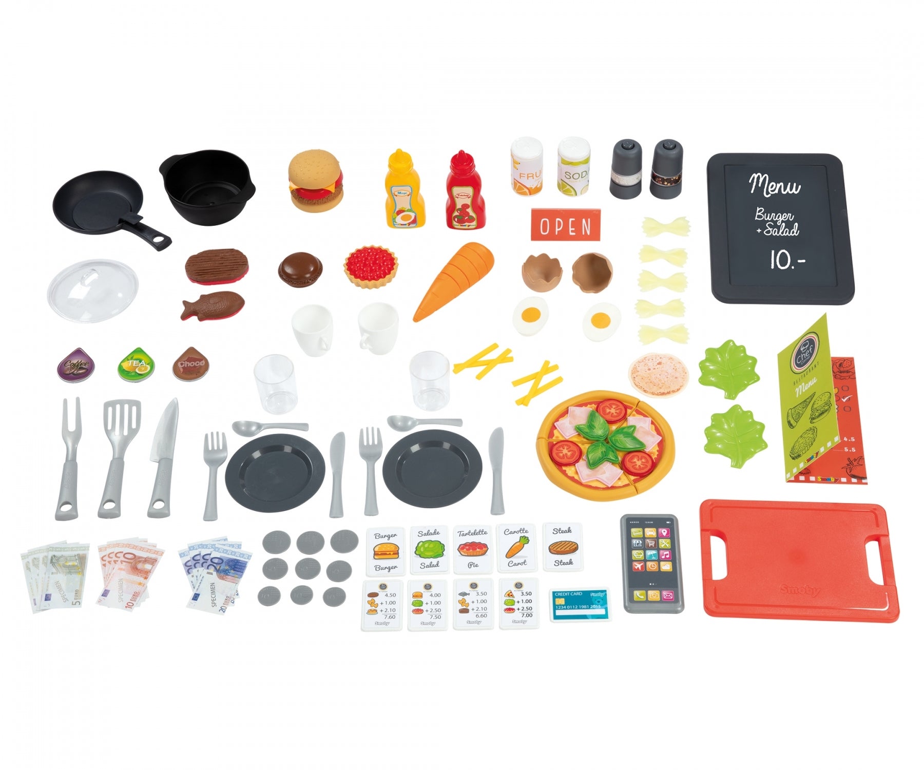 The dining area includes a table, stool, and menu, while order tickets let children take and serve orders like real restaurant staff. The fully equipped kitchen provides everything needed to prepare and serve meals, encouraging creativity, social interaction, and hand-eye coordination.