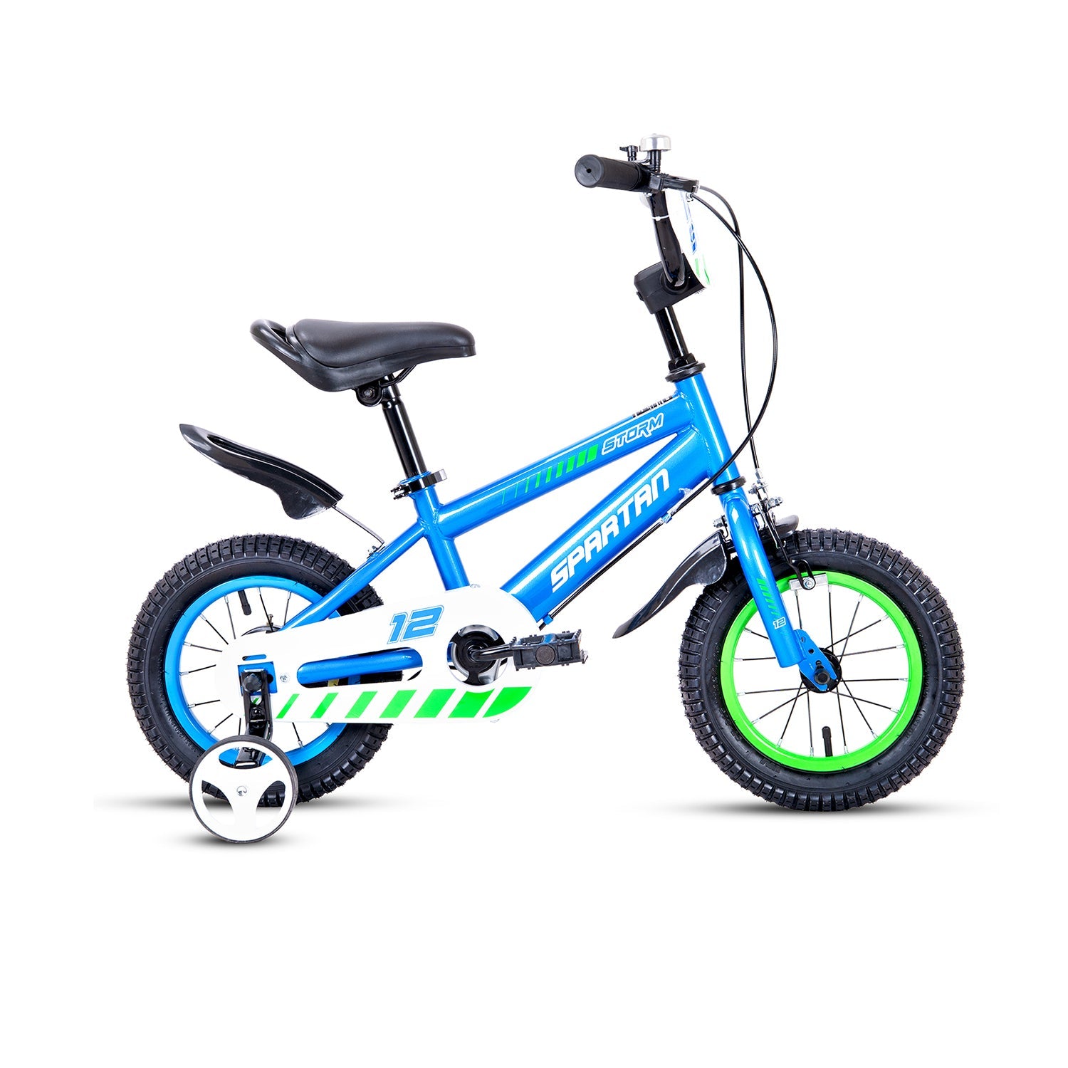 A padded saddle and ergonomic grips enhance rider comfort, while the wide tires provide added stability on different surfaces. With its vibrant blue finish and sporty graphics, this bike doesn’t just perform well—it looks exciting too. Perfect for first rides in the park, around the neighborhood, or alongside parents, the Spartan 12" Storm is built to help kids ride with confidence.