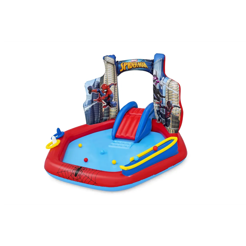 Everyone's favorite web-slinging superhero, Spider-Man', is ready to swing into action with the Spider-Man Inflatable Play Center! Simply inflate the play center and fill the pool with up to 165 L (44.6 gal.) of water, attach a garden hose (not included) to the archway to activate the sprayer, and let the adventures begin.