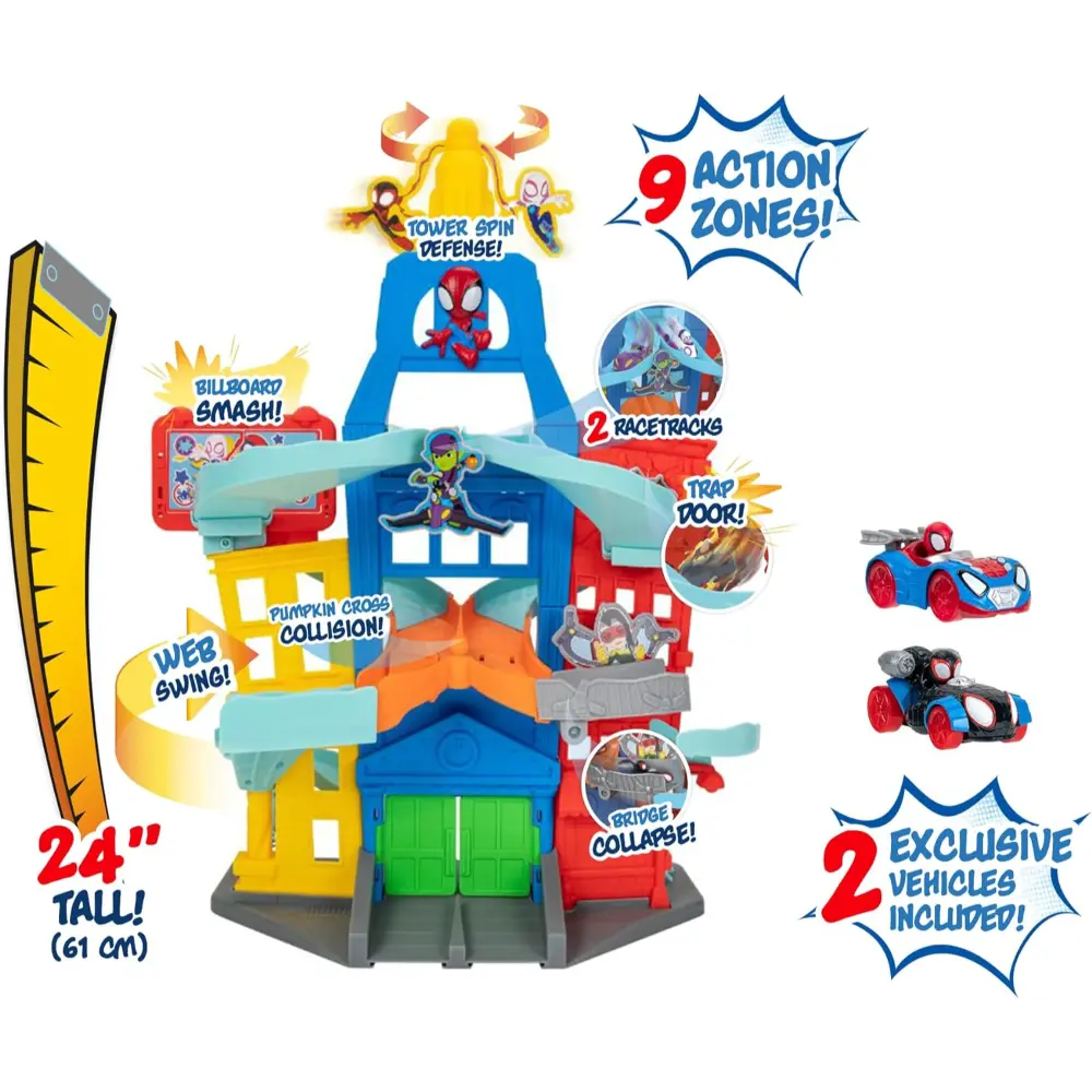 Introducing the Track Set Spidey Amazing Metals City Track Set - a thrilling addition to any young adventurers toy collection. The set features a realistic cityscape track with lights and sound, 12 action zones and 3 level elevator for Spidey to navigate. Includes 3inch diecast vehicles.