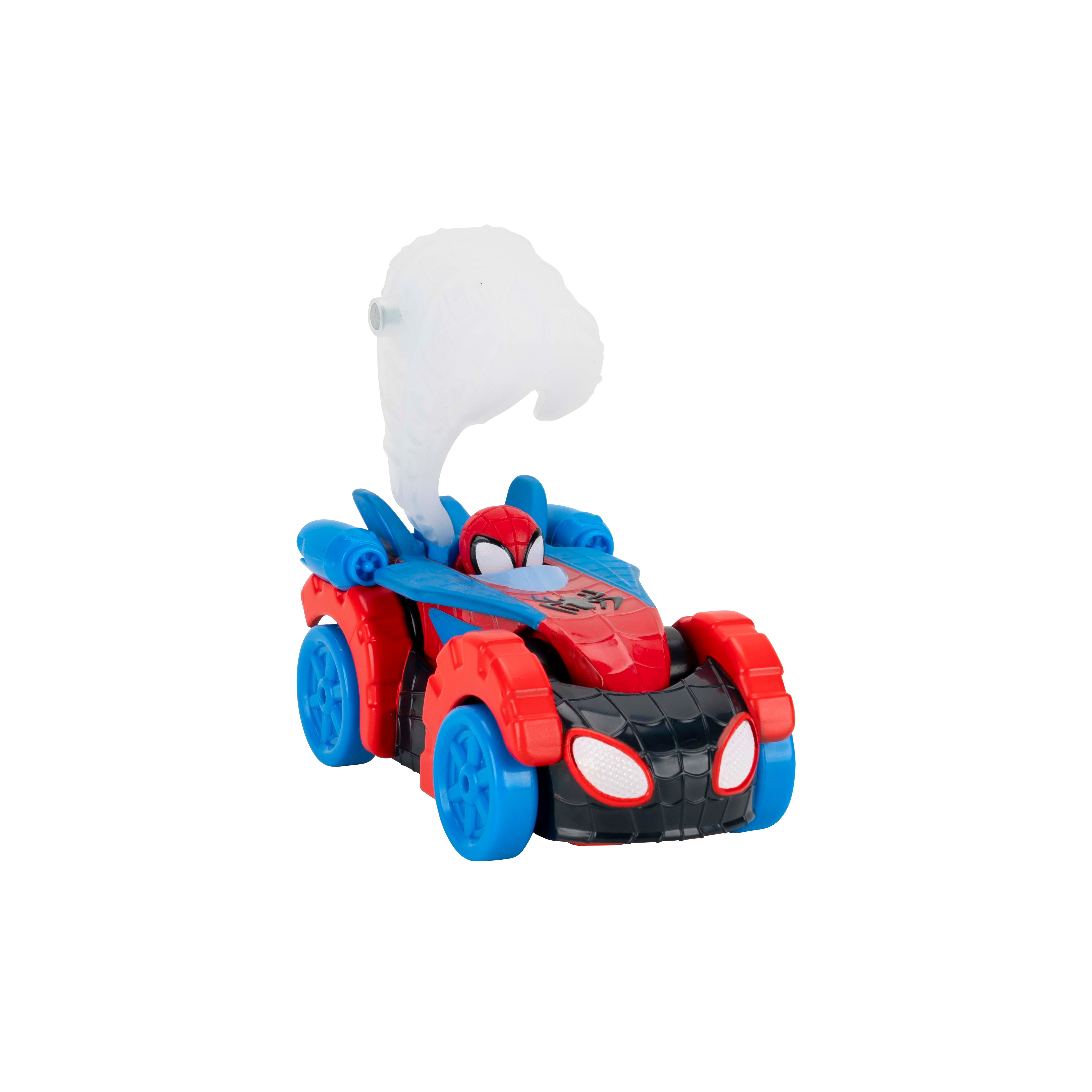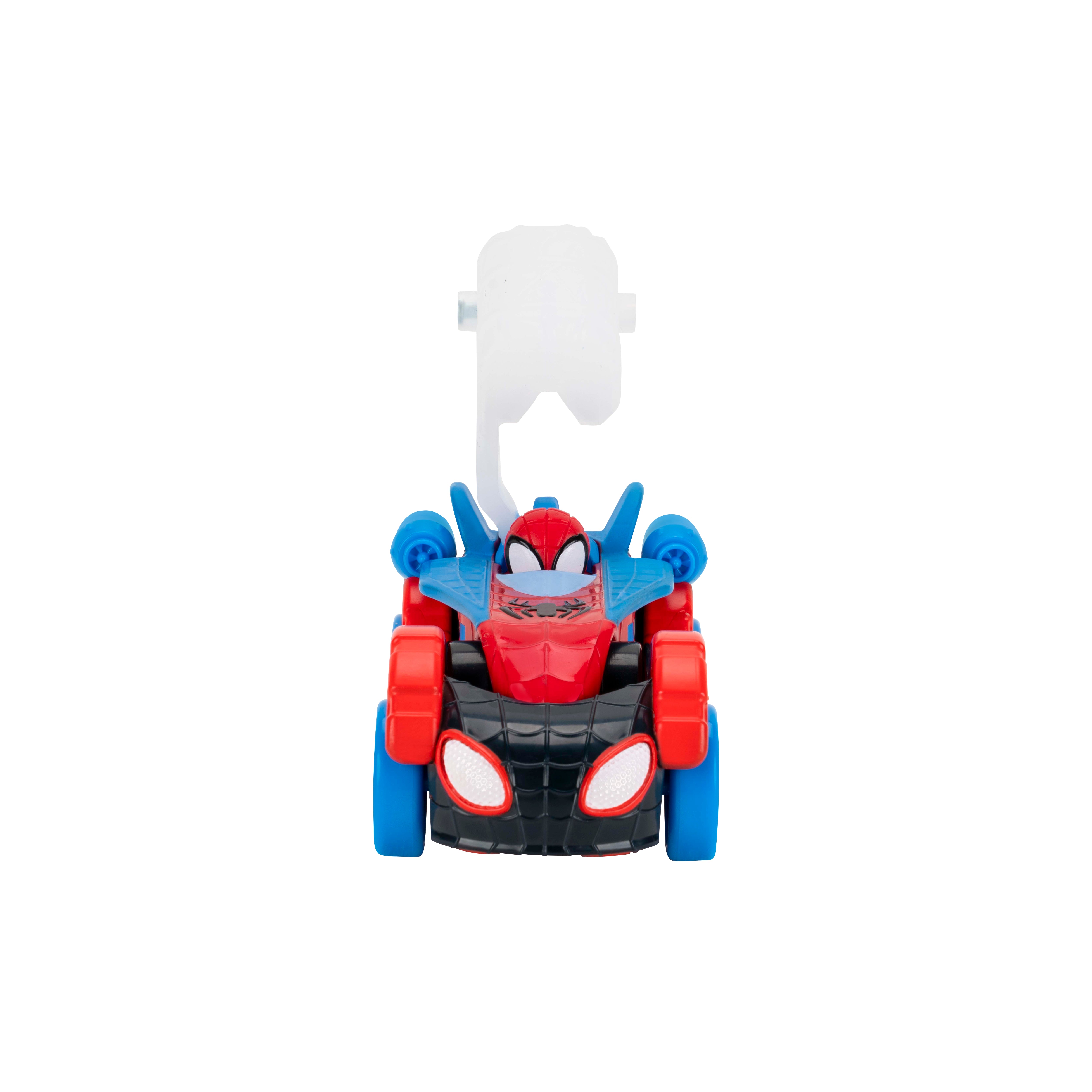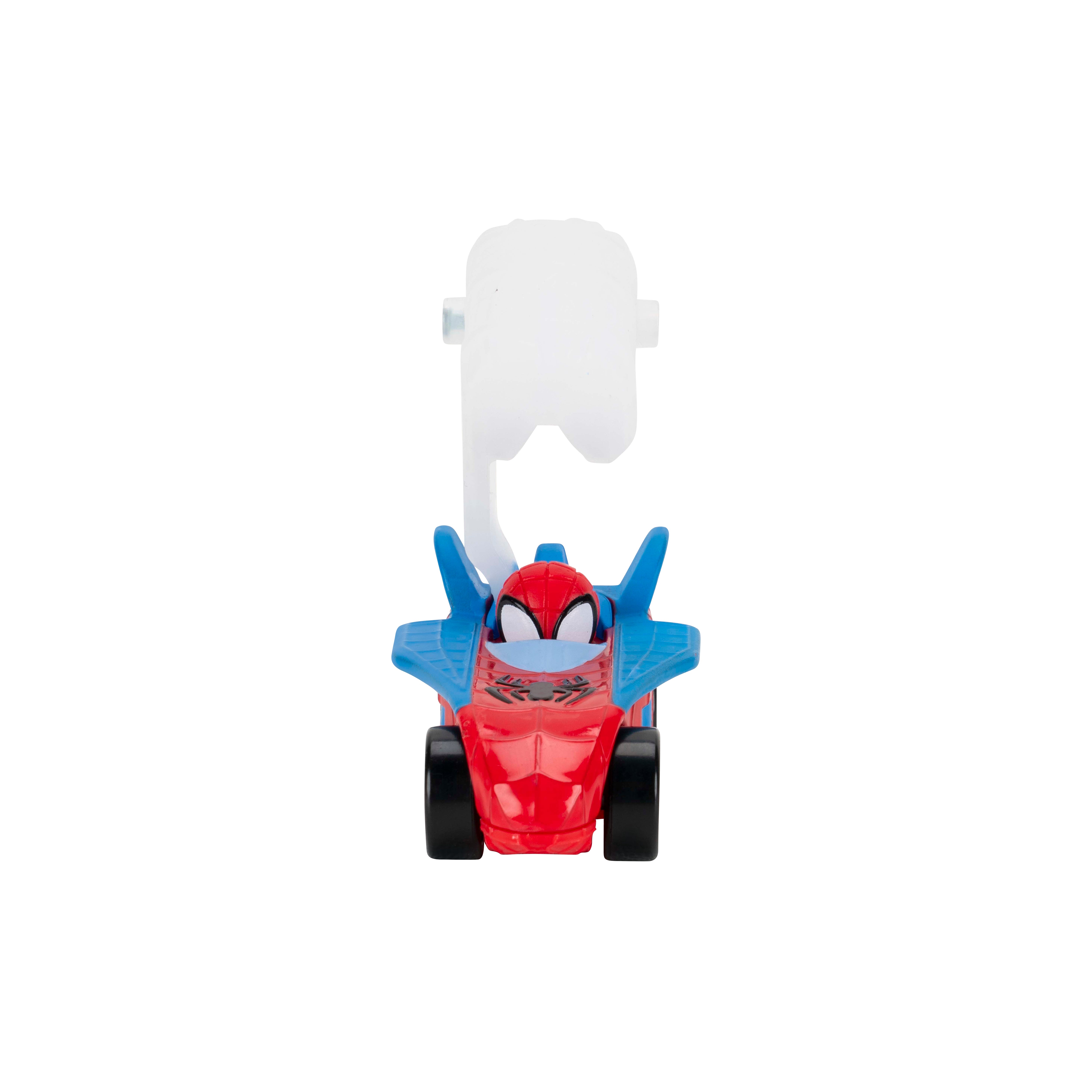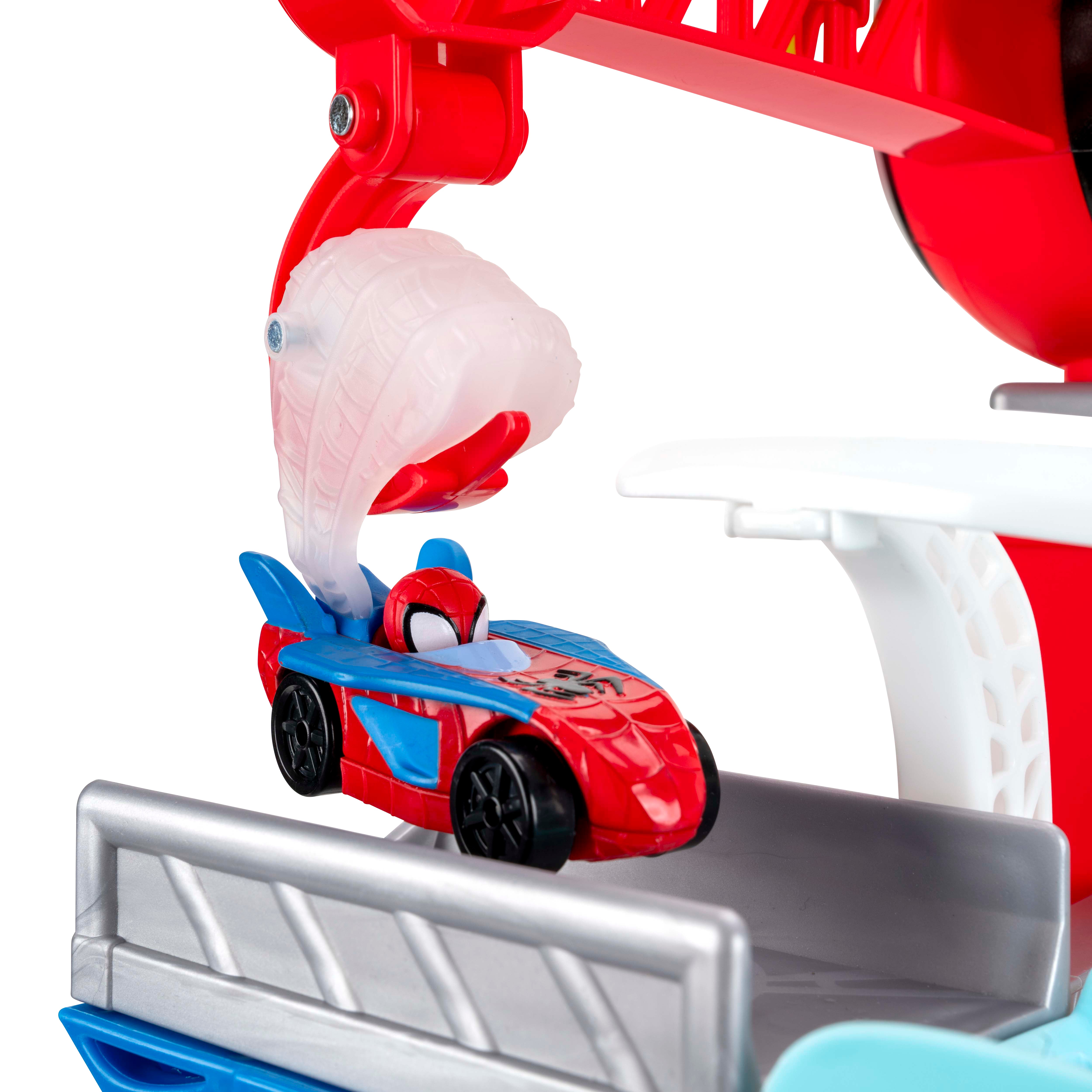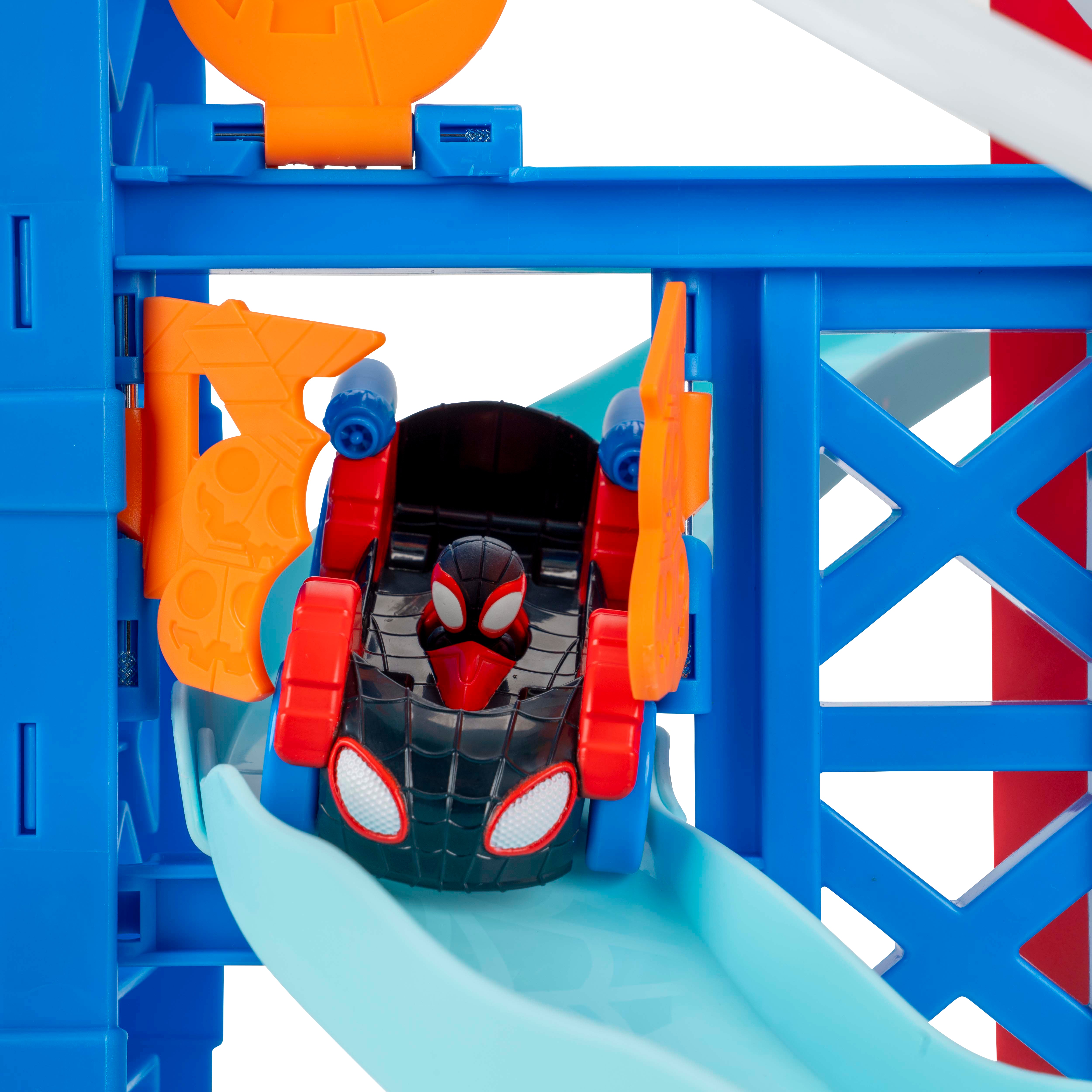 Zip into action with the MARVEL Spidey and His Amazing Friends Construction Zone Chaos Track Set! This deluxe 2-foot-high racing adventure features a zip line, multiple action zones, and two separate tracks for Spidey and Spin. Start by stacking the two exclusive 3-inch Amazing Metals vehicles—Spidey on top of Spin—and launch them together. As they speed down the track, Spidey hooks onto the zip line and splits from Spin, sending both heroes on their own exciting missions. Spidey glides down the zip line, knocks down the Green Goblin Pole, blasts past the Pumpkin Smash, and drops back onto the track. Spin continues racing across Doc Ock’s Bridge and through Green Goblin Goo. Whoever breaks through the final barricade launches the Web Cage to trap Green Goblin and save the day!