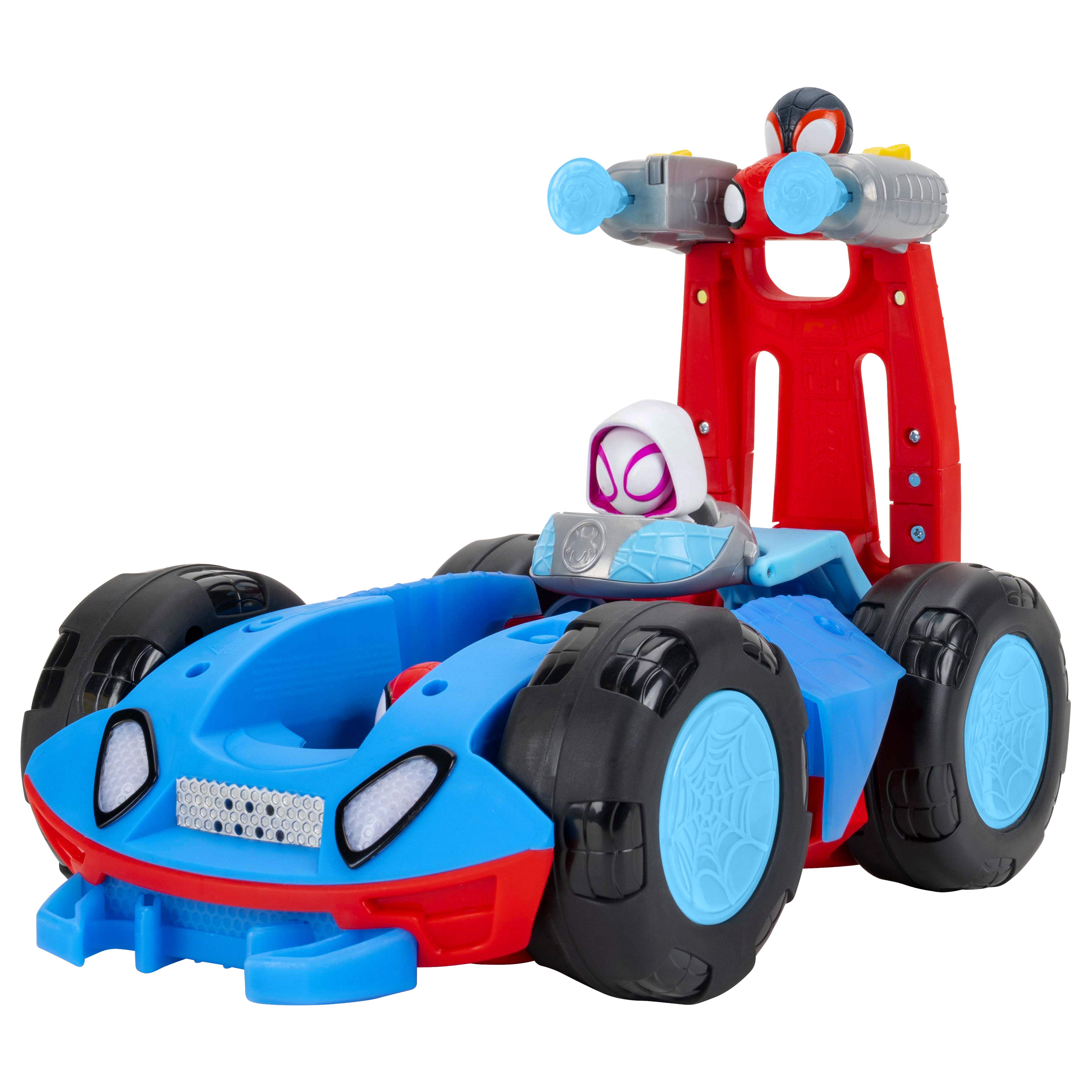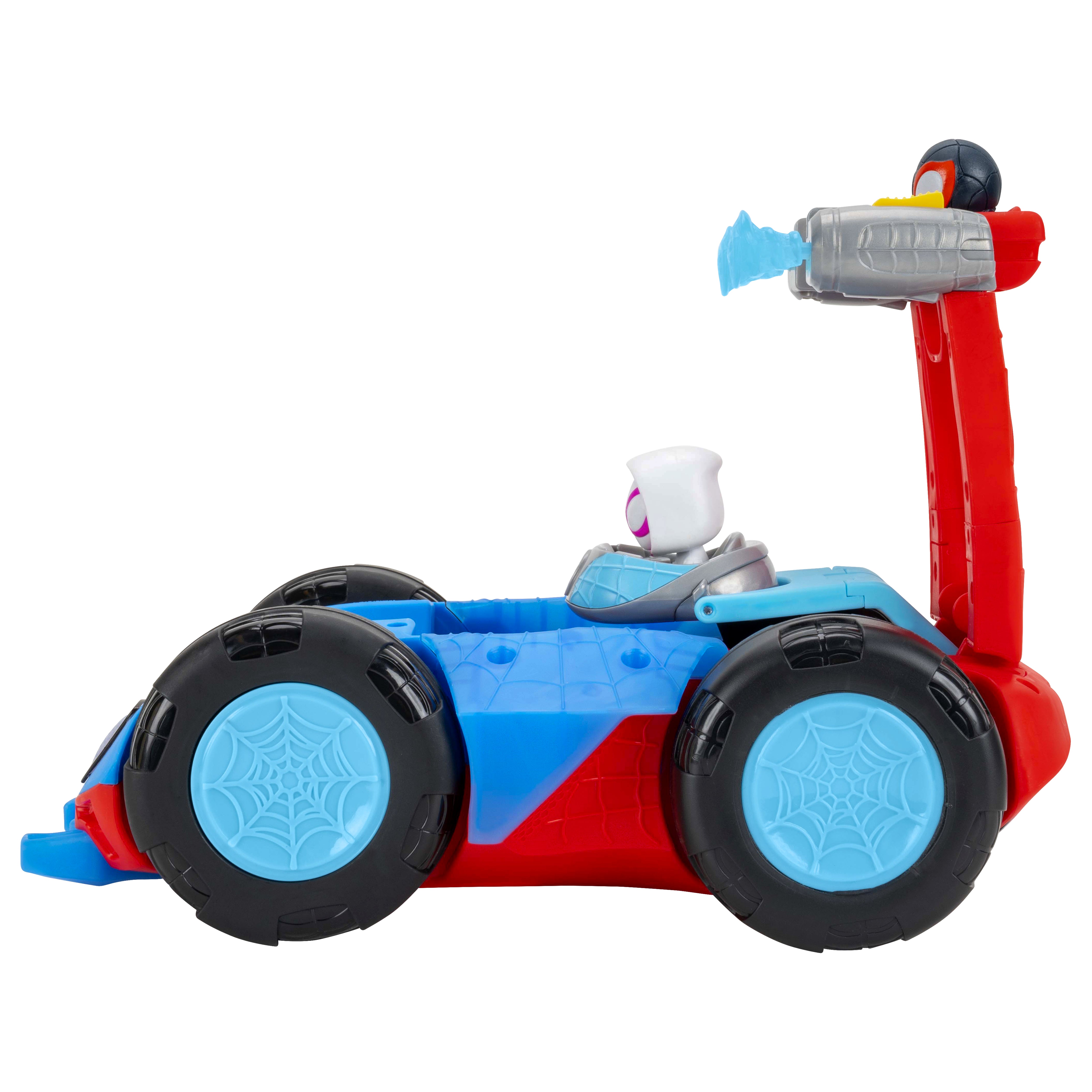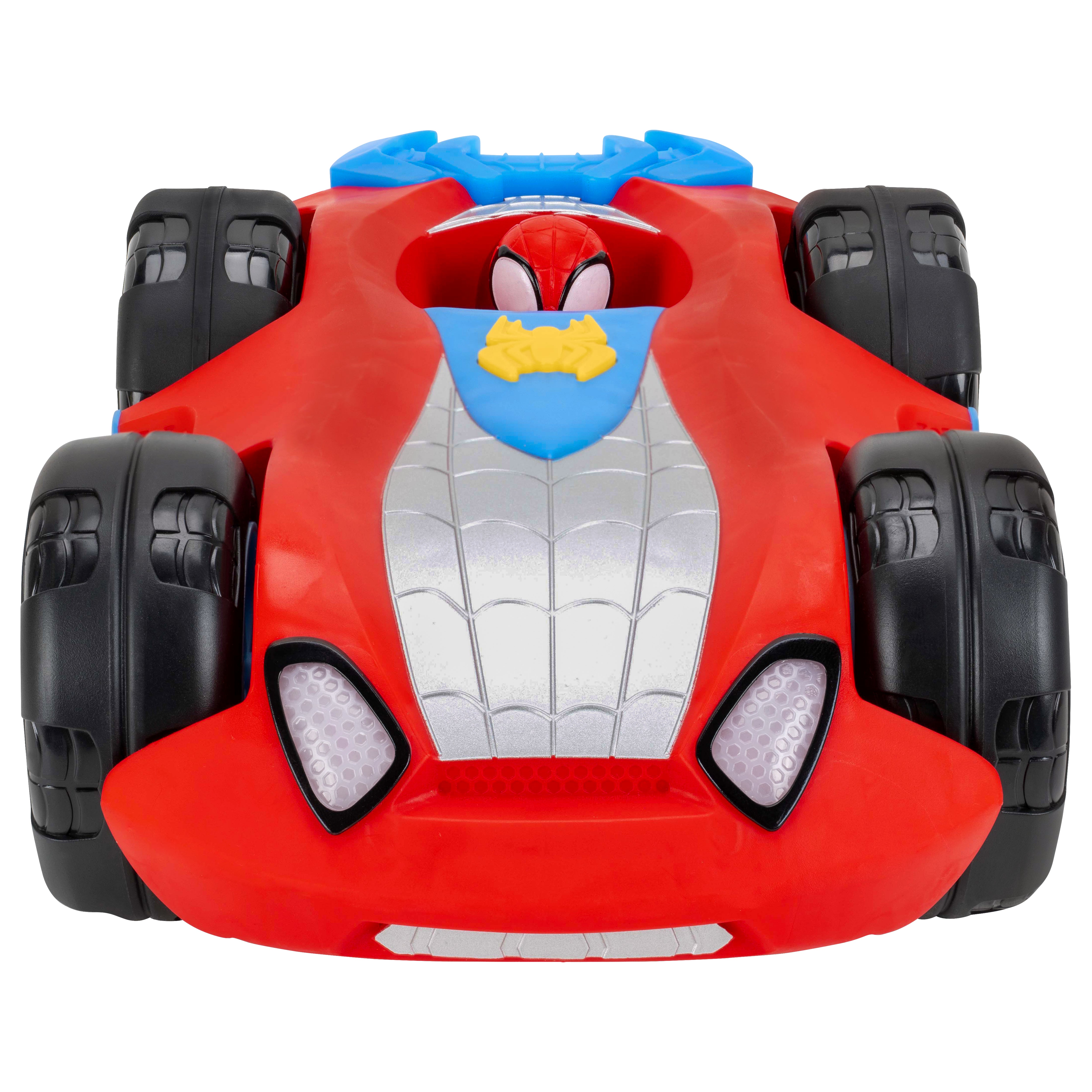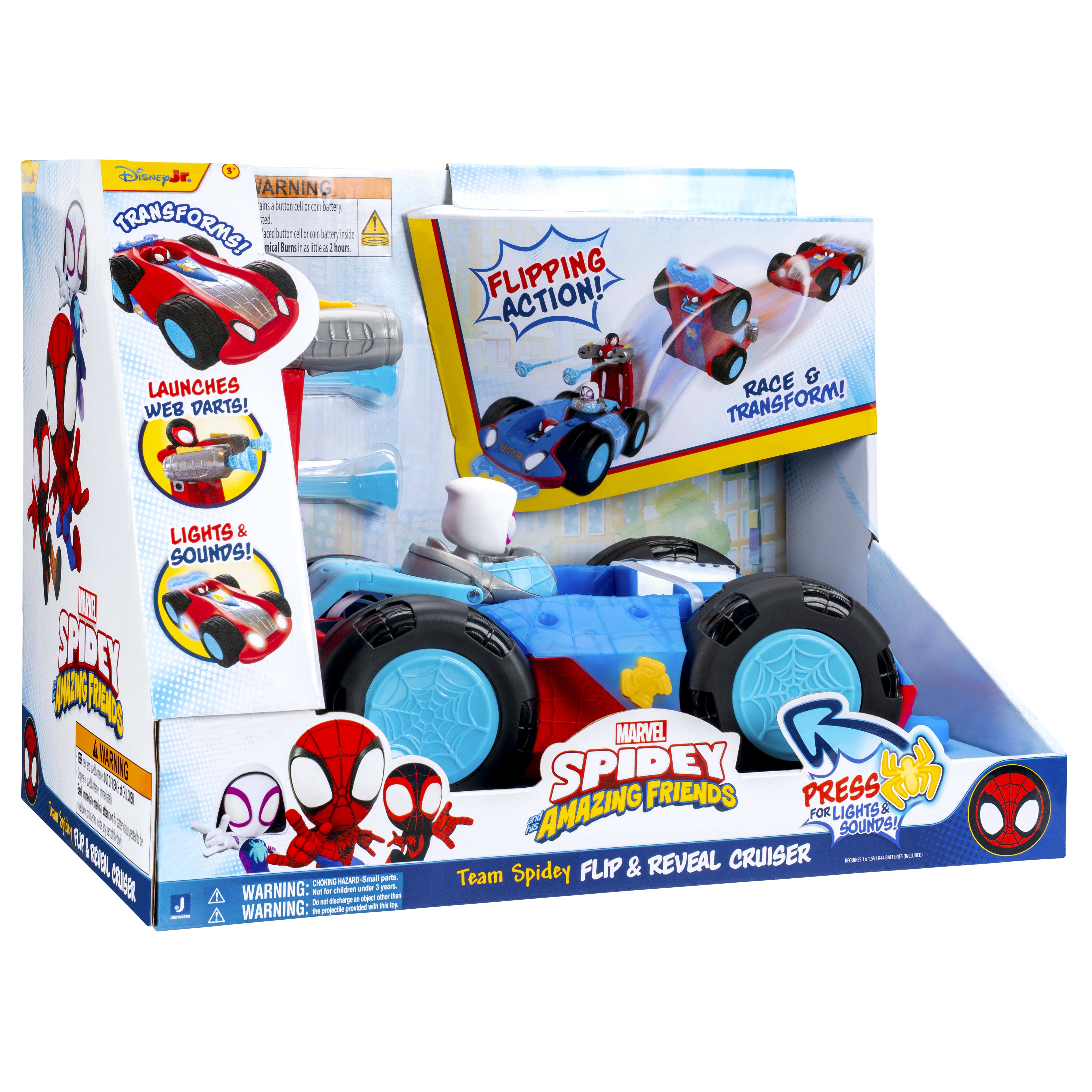 Set up the ultimate Spidey surprise with the MARVEL Team Spidey Flip and Reveal Cruiser! This deluxe double-sided vehicle transforms from a speedy cruiser into a full Team Spidey caravan for an action-packed reveal. Start in Closed Mode with Spidey behind the wheel, then race forward and watch the vehicle flip to uncover Ghost-Spider, Spin, and dual Web Blast Launchers. Kids can also activate exciting lights and sounds using the buttons on the hood and sides. Inspired by Marvel’s Spidey and His Amazing Friends, this flip-action vehicle delivers thrilling play every time.