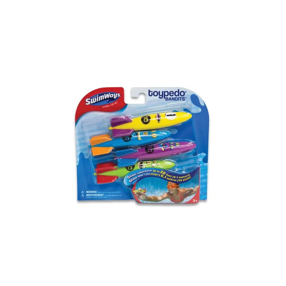 Blast off into pool-time fun with SwimWays Toypedo Bandits! This 4-pack of torpedo-shaped dive toys rockets through the water with incredible hydrodynamic action, gliding stealthily underwater up to 20 feet. Lightweight and easy for little hands to grip and throw, these mini torpedoes are perfect for everyday pool play, pool parties, and encouraging young swimmers to practice their skills. Each pack includes four colorful bandits, making them an ideal summer pool party favor for kids aged 5 and up.