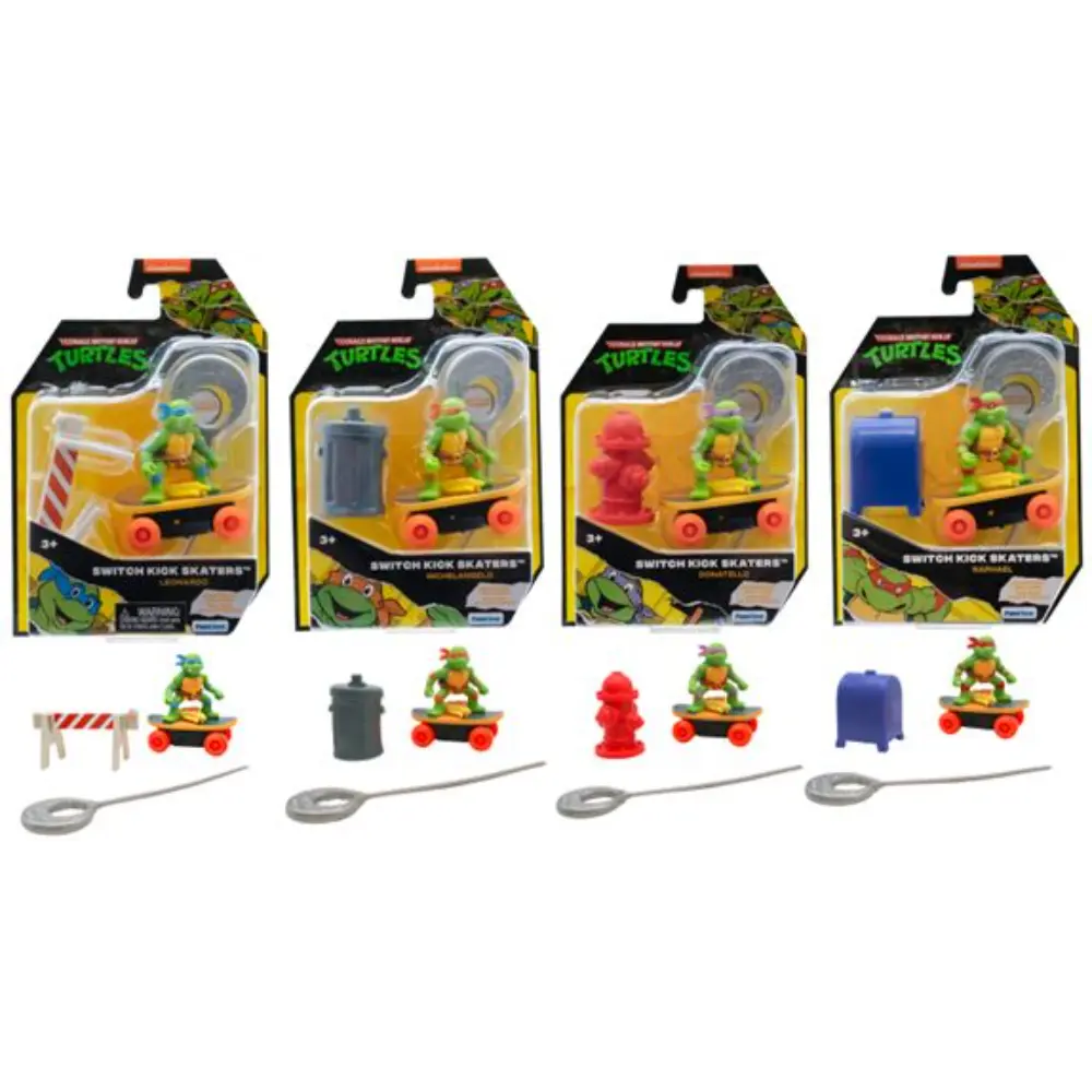 Teenage Mutant Ninja Turtles Switch Kick Skaters is a self-stabilizing skateboard that allows you to perform rad skate tricks, landing on all four wheels every time. The self-stabilizing mechanism (gyro) inside the skateboard is rip-cord powered, so insert the rip-cord, pull it out, and start performing the ultimate tricks. Collect all 4 characters!