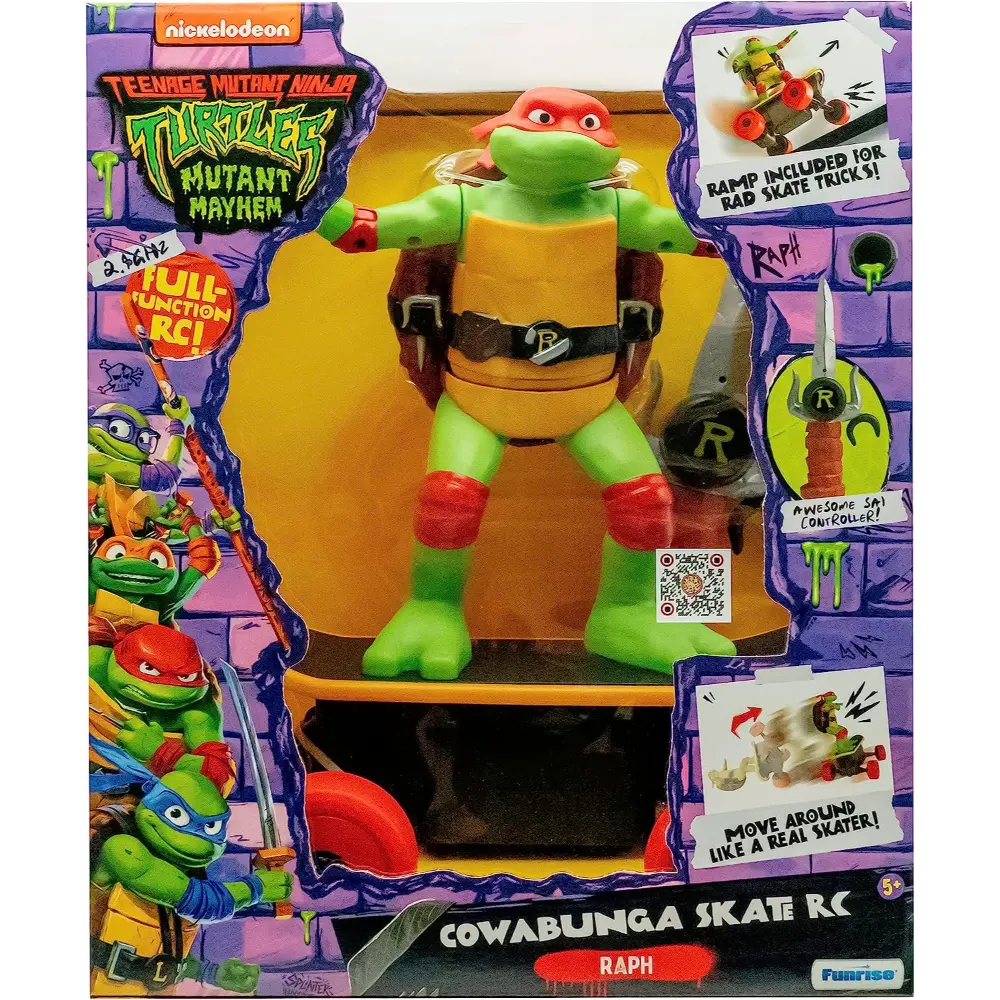 The Teenage Mutant Ninja Turtles Cowabunga Skate RC is a full-function 2.4GHz remote-controlled skateboard vehicle built for smooth riding and imitating real skateboard moves. Designed with a movie-inspired style Raphael shredding the New York City streets. Use the Sai-shaped remote control to move the skateboard side-to-side, forward, backward and any direction, just like a real skater! If he falls down, don’t worry, spin him around and he will get right back up! Cowabunga dude!