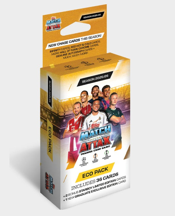 Step into the 2025/26 season with the Topps Match Attax Eco Pack! Featuring top players from the UEFA Champions League, Europa League, and Europa Conference League, this environmentally friendly pack includes a selection of cards from exciting new categories like Leaders, Cup Champions, Showboats, and Magic Memories, alongside fan favourites such as Heritage, Team Badges, Chrome Shield, and the iconic 100 Club.