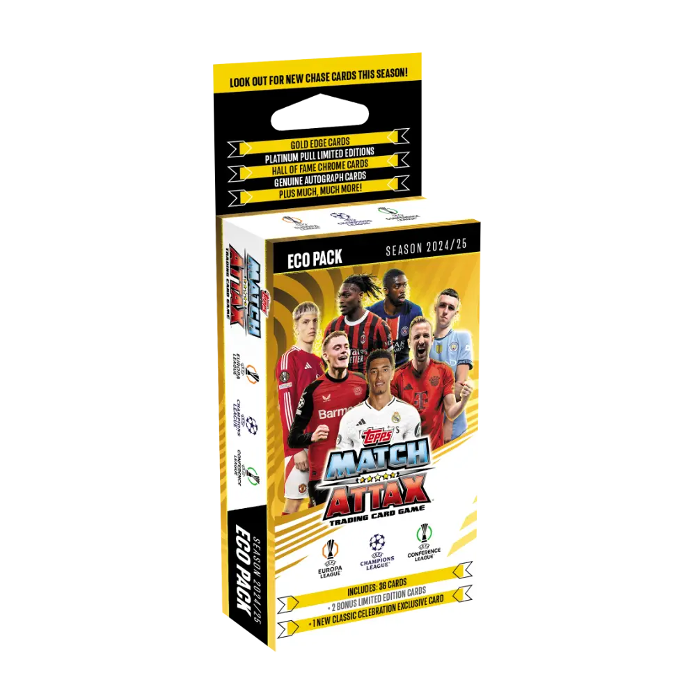 Get ready for the 2024/2025 UEFA Champions League season with the officially licensed Topps Match Attax Eco Pack bundle. This exclusive set includes 36 Match Attax trading cards, 2 random Limited Edition cards, and a special New Classic Celebration exclusive card to jumpstart your collection. Perfect for both seasoned collectors and newcomers, the bundle also comes with 100 card protectors to keep your cards in pristine condition. Build and safeguard your ultimate Match Attax collection for an exciting season of football action!