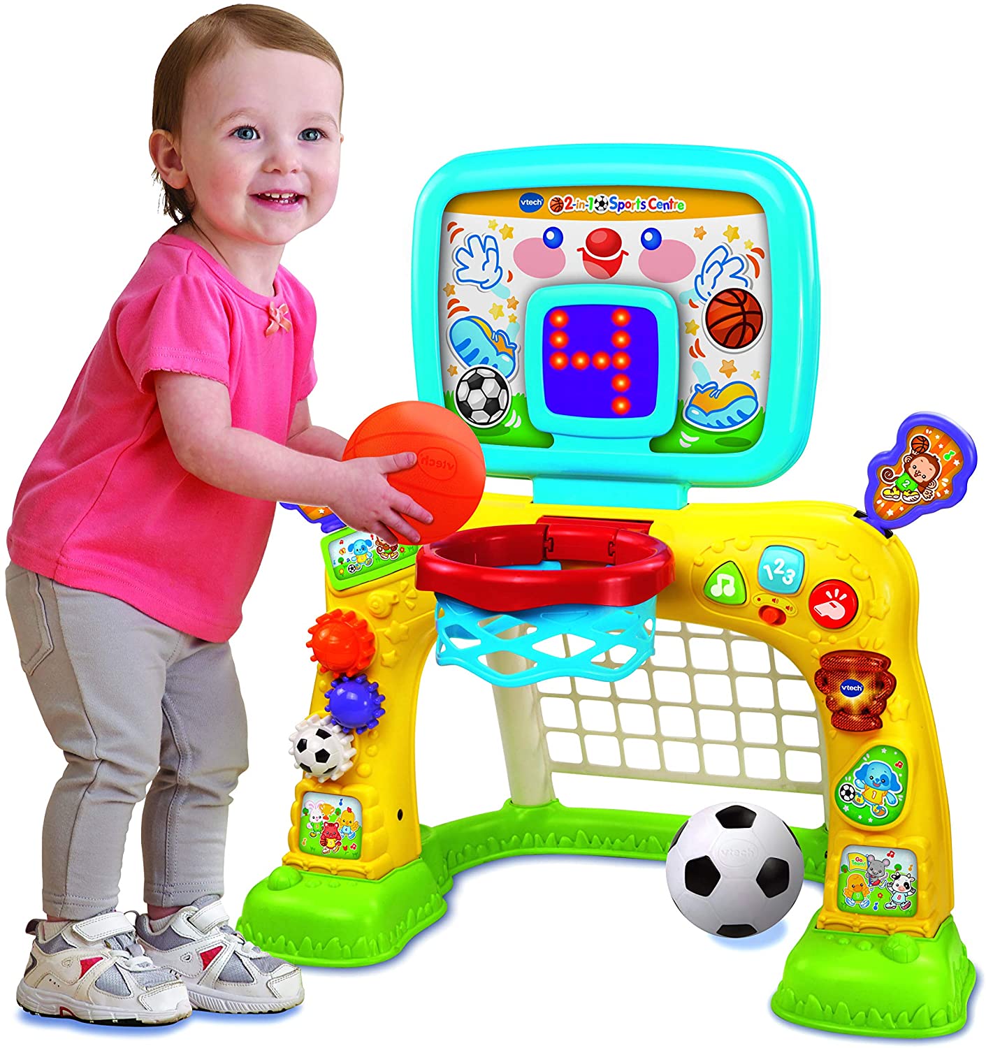 Cheer on your little sports star with the VTech® 2-in-1 Sports Centre, an exciting and interactive playset that combines a football net and basketball hoop for endless active fun! Designed to encourage physical play and learning, this electronic sports centre keeps kids moving while teaching numbers, shapes, and coordination skills.