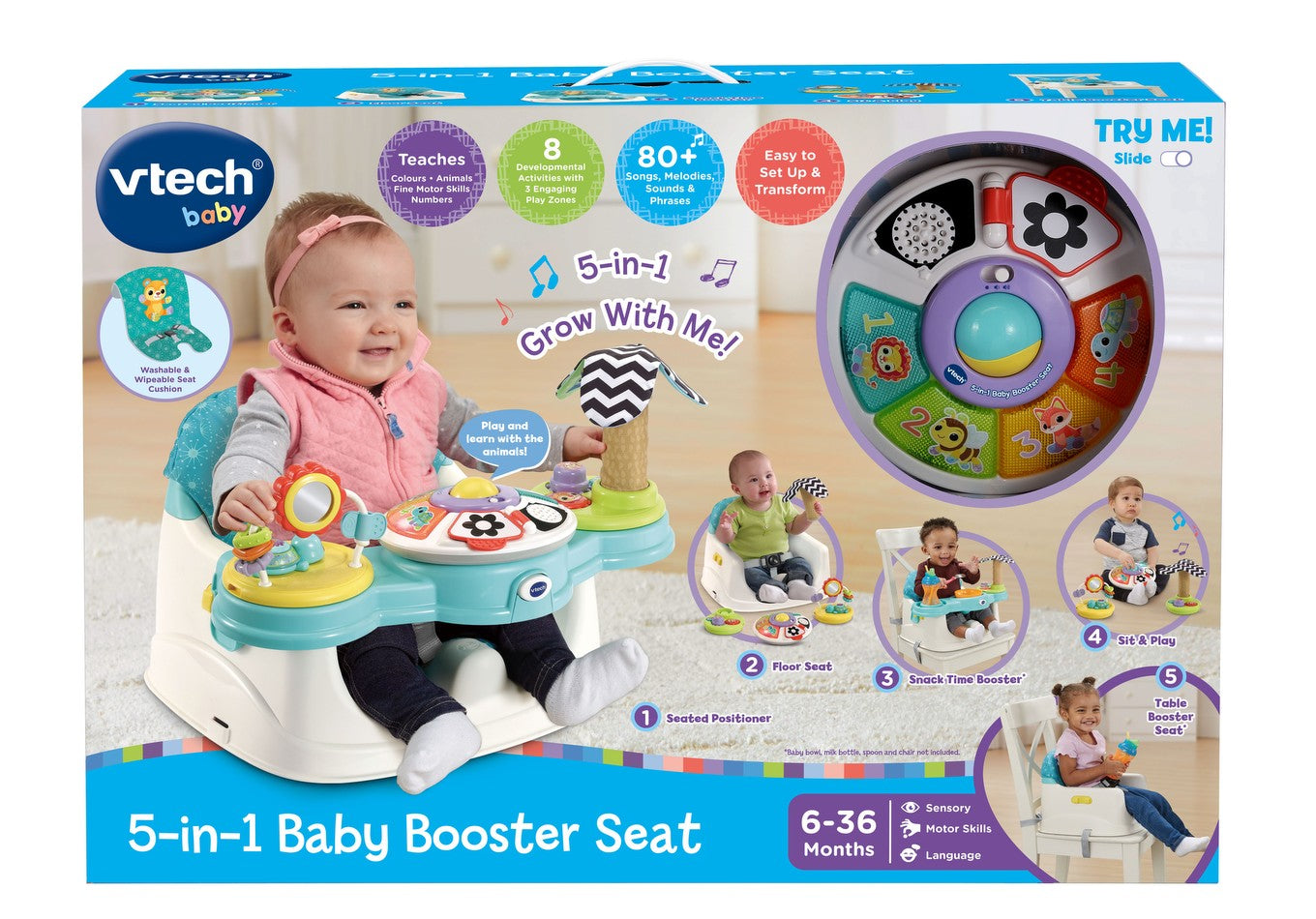 The VTech 5-in-1 Baby Booster Seat is a versatile, engaging, and safe seat designed to grow with your child from baby to toddler. With its multifunctional design, it easily converts into a floor seat, snack-time booster, sit-and-play seat, and table booster, offering long-lasting use for everyday routines.
