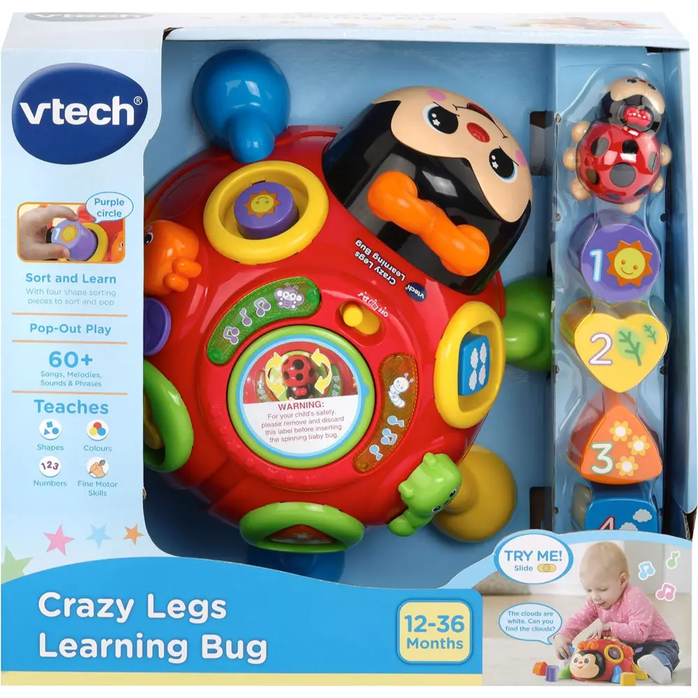 Wobbly surprises and learning fun await with the Crazy Legs Learning Bugs interactive pull toy! Perfect for children aged 12 to 36 months, this adorable bug features four colorful shape blocks that toddlers can sort and pop into matching slots on mommy ladybug’s back. Press the baby ladybug to pop the blocks out after sorting. When little ones press the light-up buttons on the bug’s back, they’ll hear playful music, nature sounds, and educational phrases. With over 35 sounds and phrases in Learning mode covering shapes, colors, numbers, and nature objects, and 25+ songs and melodies in Music mode, this toy is designed to engage and educate. The storable pull-along cord lets toddlers pull their buggy friend when they start to toddle, while additional features like a flapping butterfly and sliding caterpillar provide extra manipulative play.