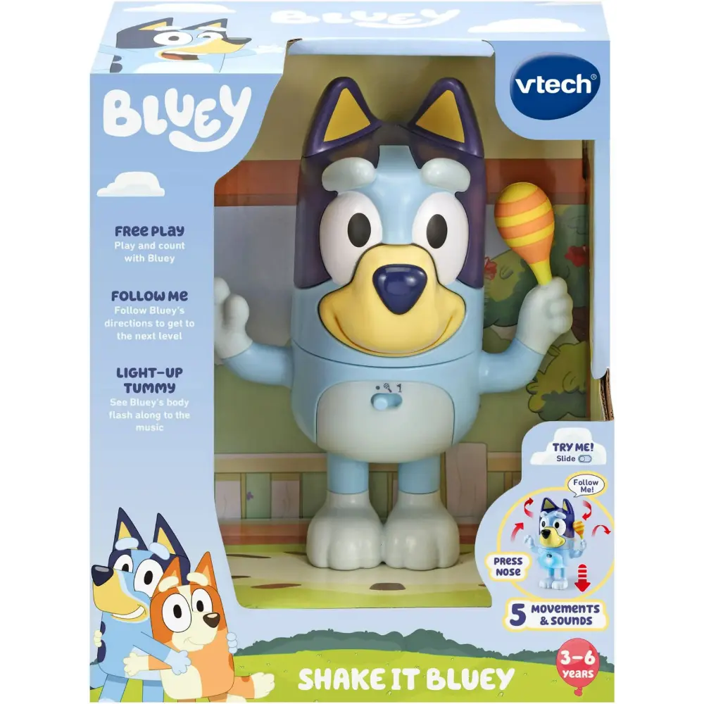 Shake, dance, and play with Shake It Bluey! This interactive Bluey toy invites kids to bop, turn, tap, and follow fun game instructions that build coordination and listening skills. Turn Bluey’s head to peek around, wave the hand to play ticklecrabs, shake the shaker, press her nose for a sneeze, and bop her body to count to ten. Follow the game prompts to twist and move body parts in sequence, then switch to dance mode and watch Bluey’s tummy light up to the music. Perfect for active, imaginative play for ages 3–6.