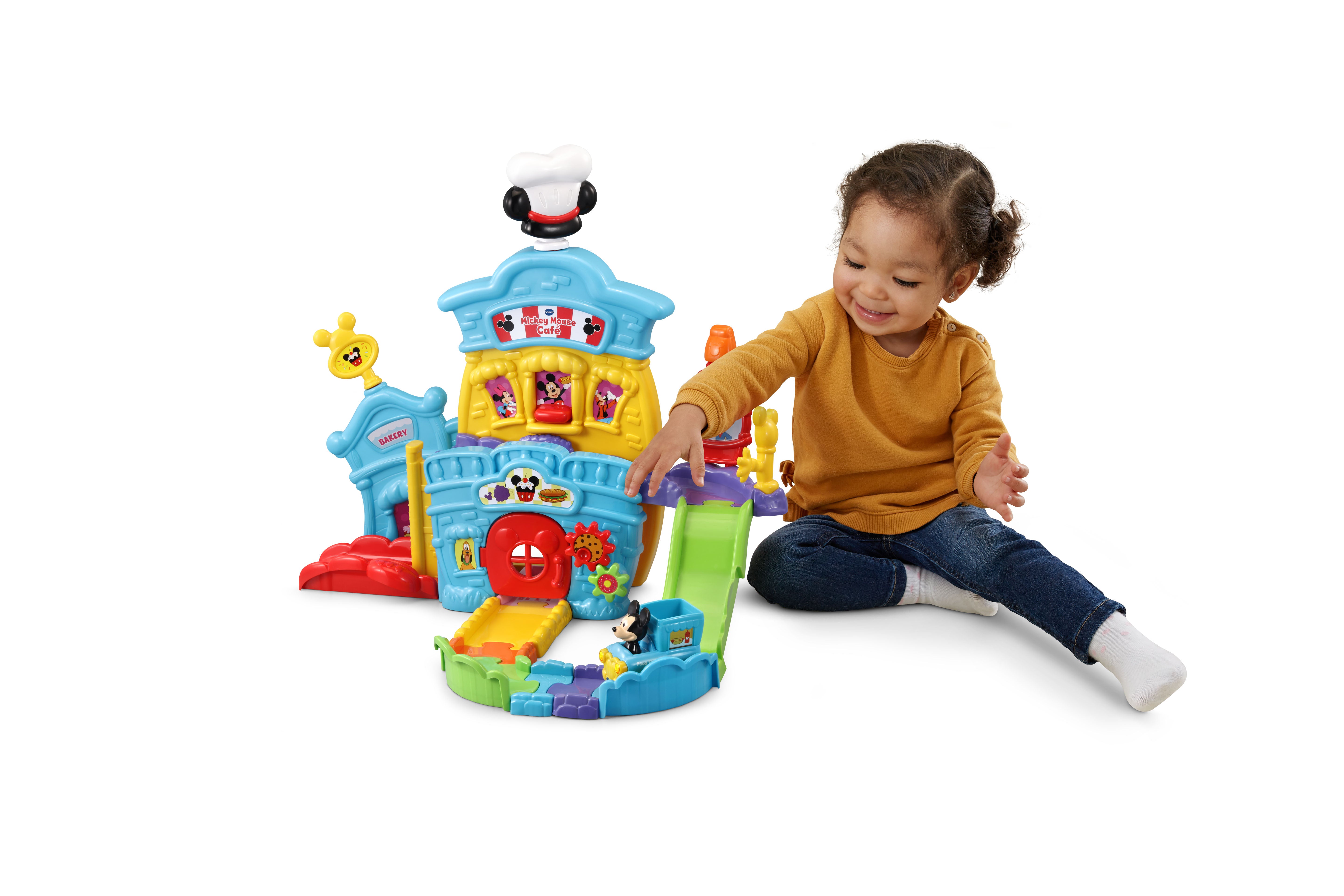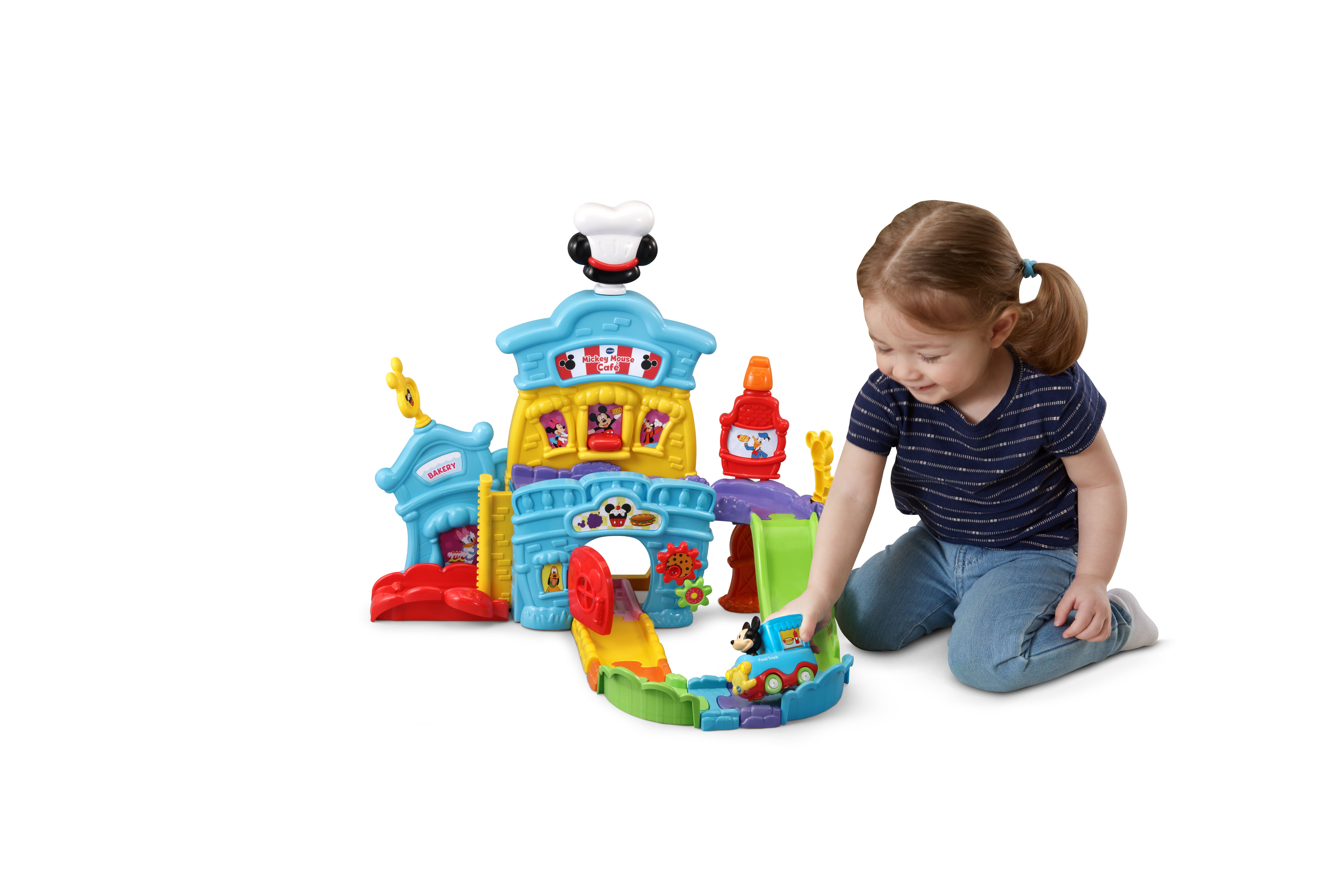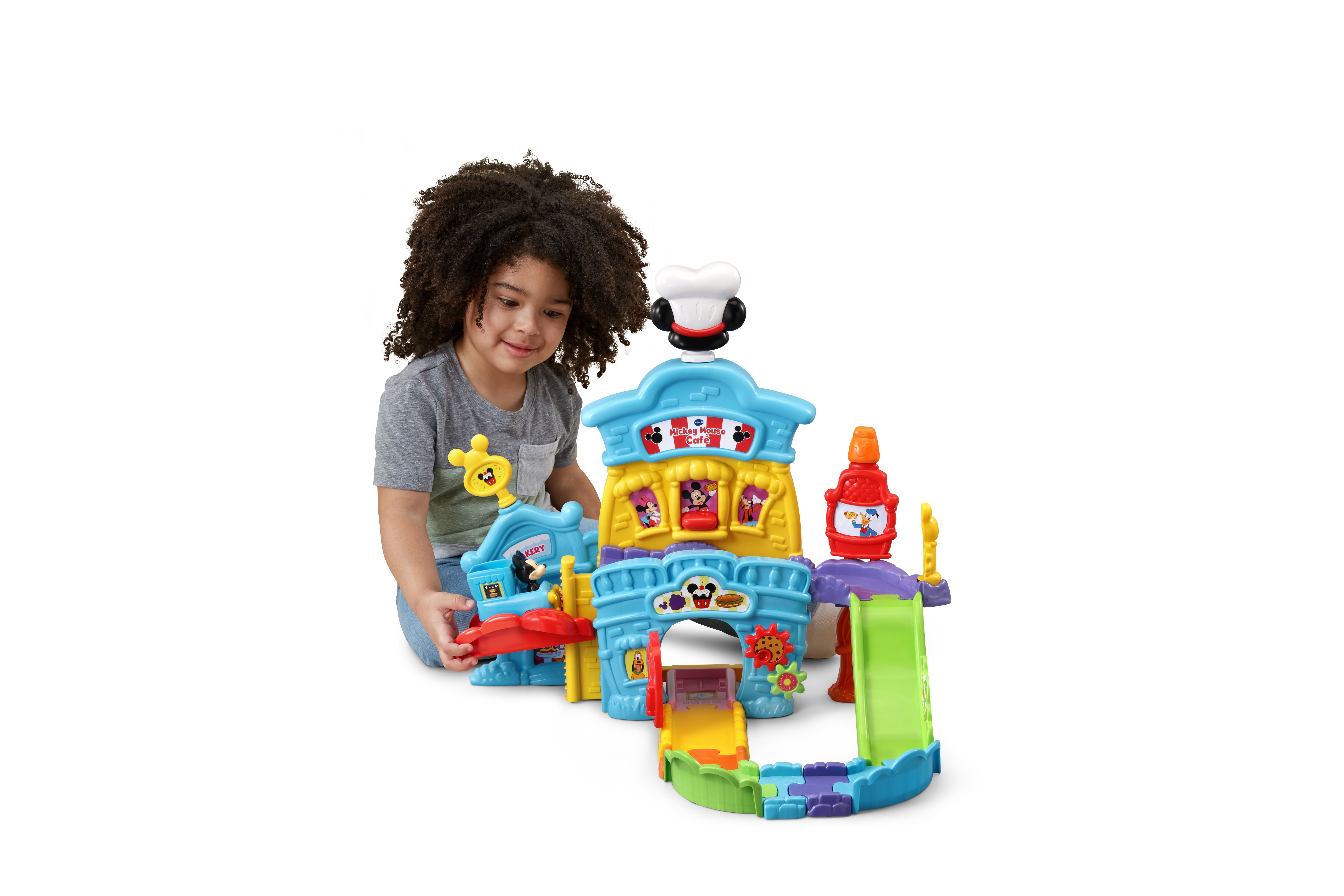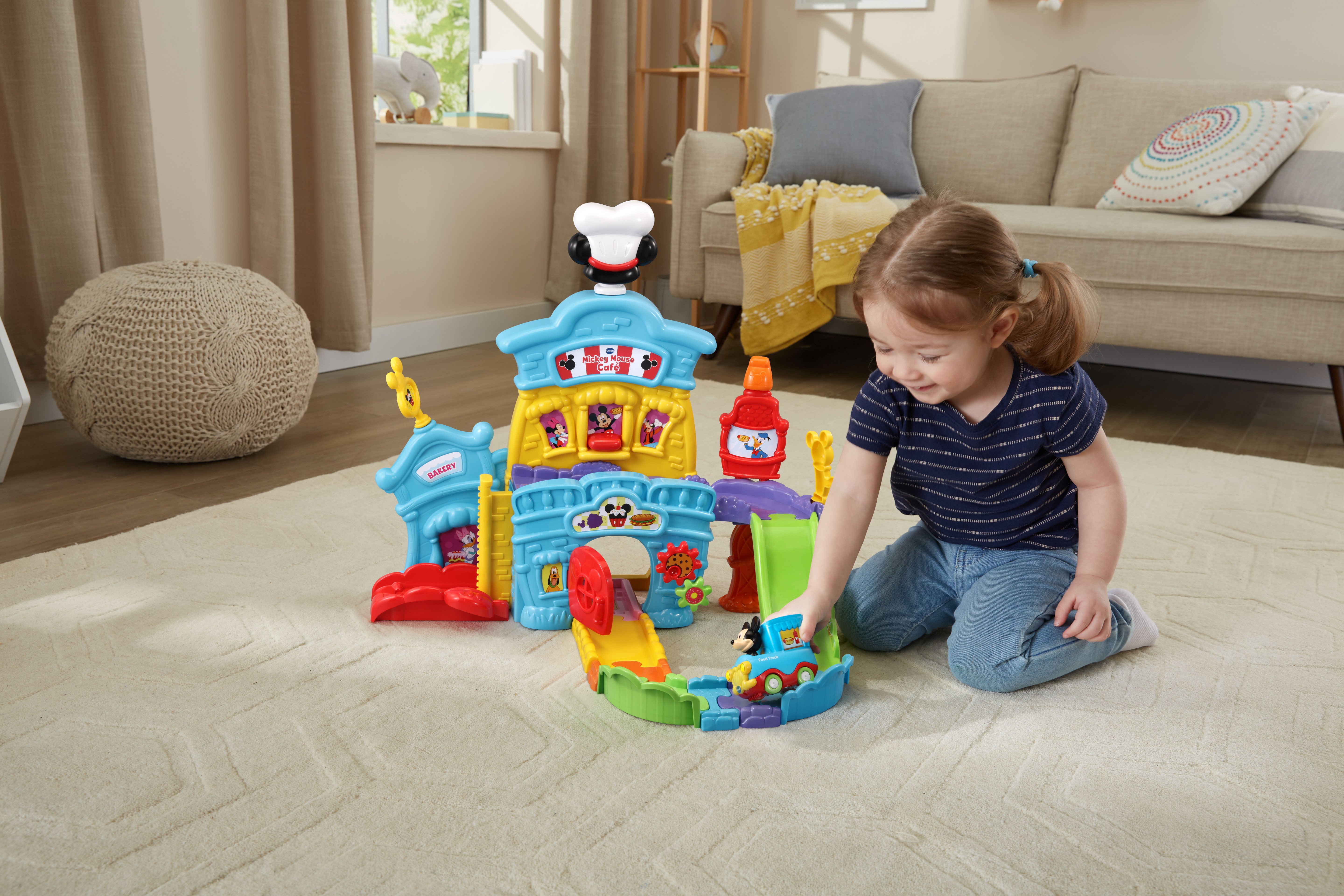 The VTech Go! Go! Smart Wheels Mickey Mouse Café brings imaginative, café-themed fun to little learners. Kids can move the Mickey Mouse Food Truck along tracks, open and close the window and door, and raise or lower the elevator—all while building motor skills. Through playful sounds, phrases, and character interactions, this set teaches the letter F, and adds extra excitement with three sing-along songs and six melodies. Compatible with all Go! Go! Smart Wheels / Toot-Toot Drivers playsets (sold separately).