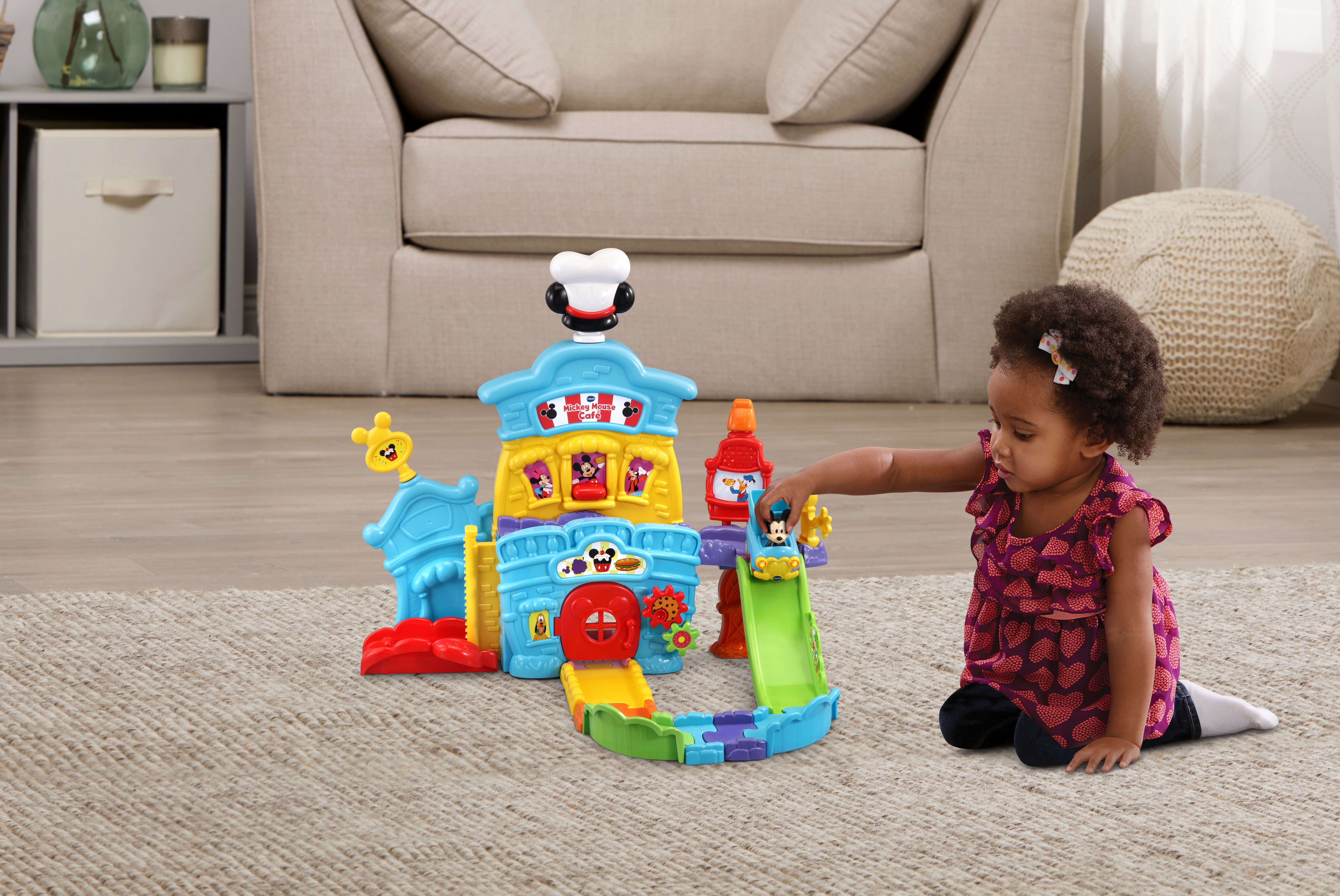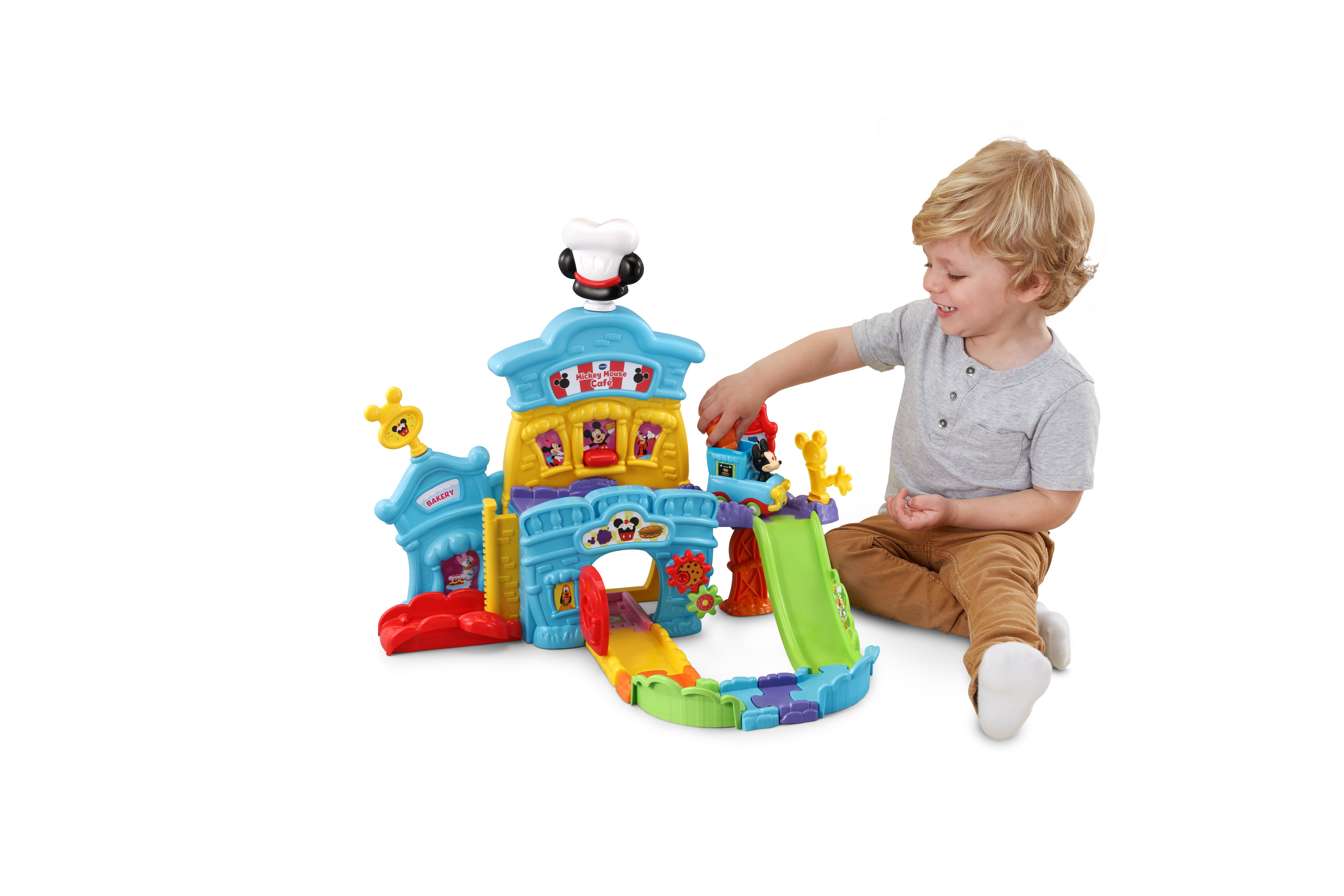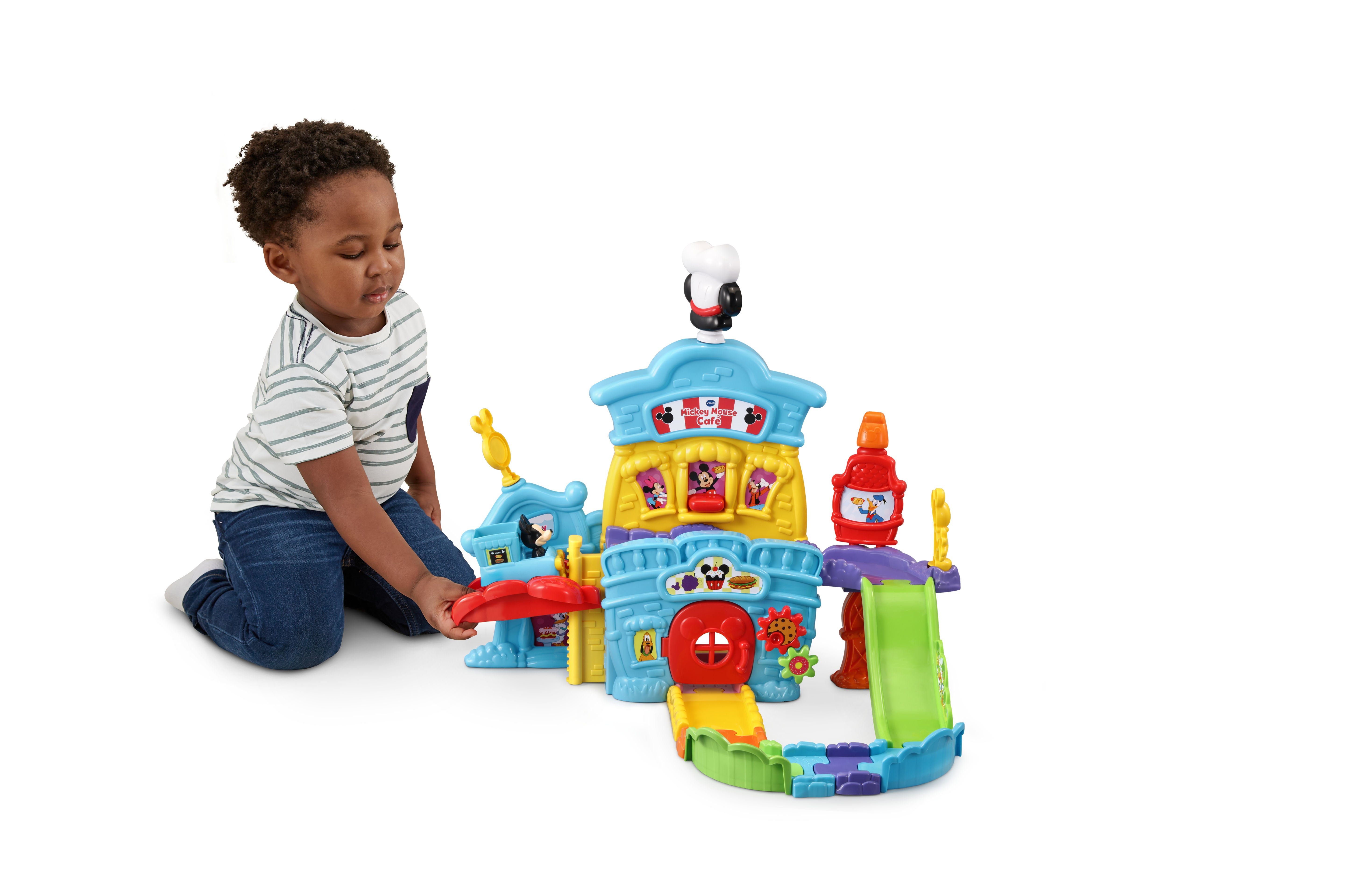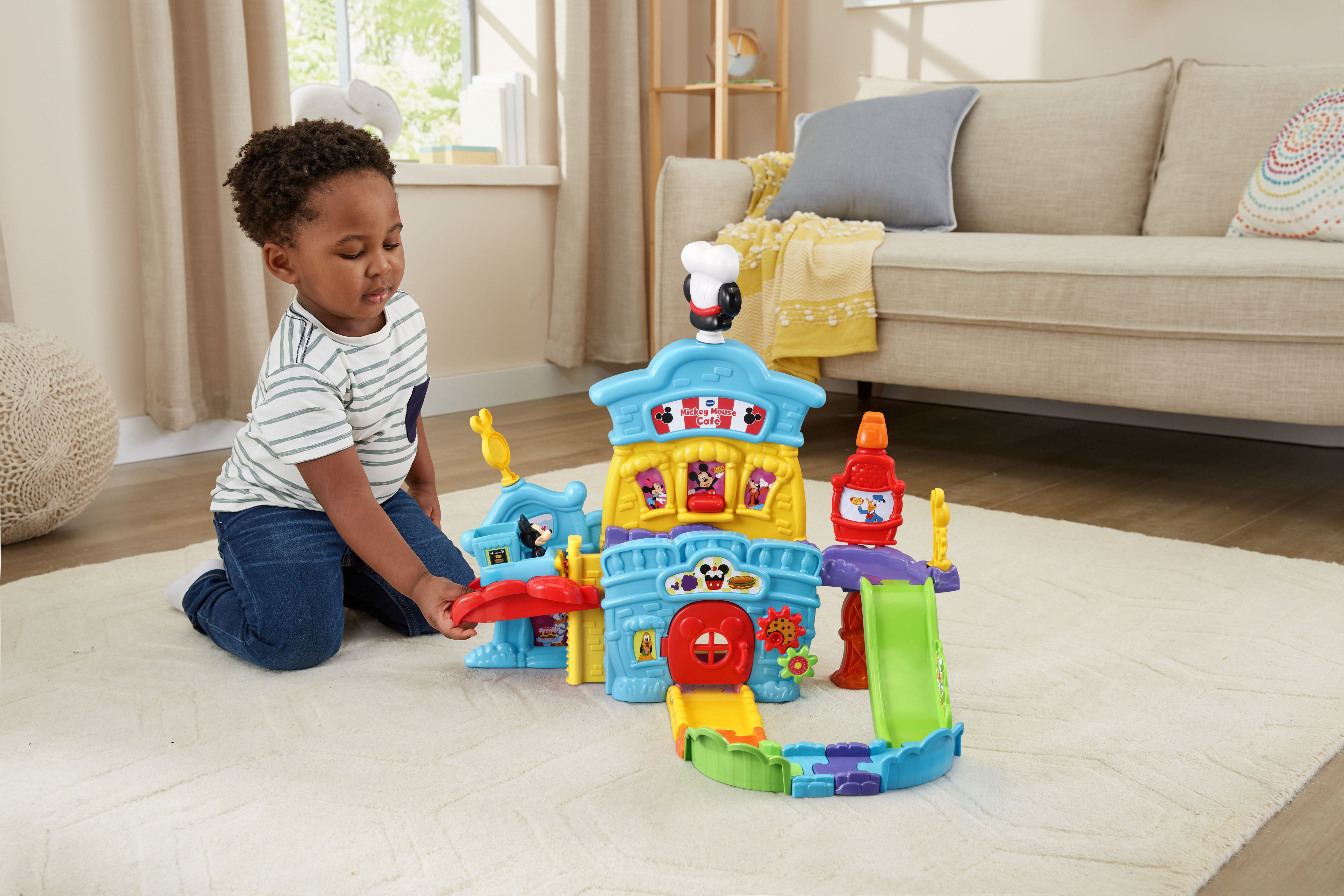 The VTech Go! Go! Smart Wheels Mickey Mouse Café brings imaginative, café-themed fun to little learners. Kids can move the Mickey Mouse Food Truck along tracks, open and close the window and door, and raise or lower the elevator—all while building motor skills. Through playful sounds, phrases, and character interactions, this set teaches the letter F, and adds extra excitement with three sing-along songs and six melodies. Compatible with all Go! Go! Smart Wheels / Toot-Toot Drivers playsets (sold separately).