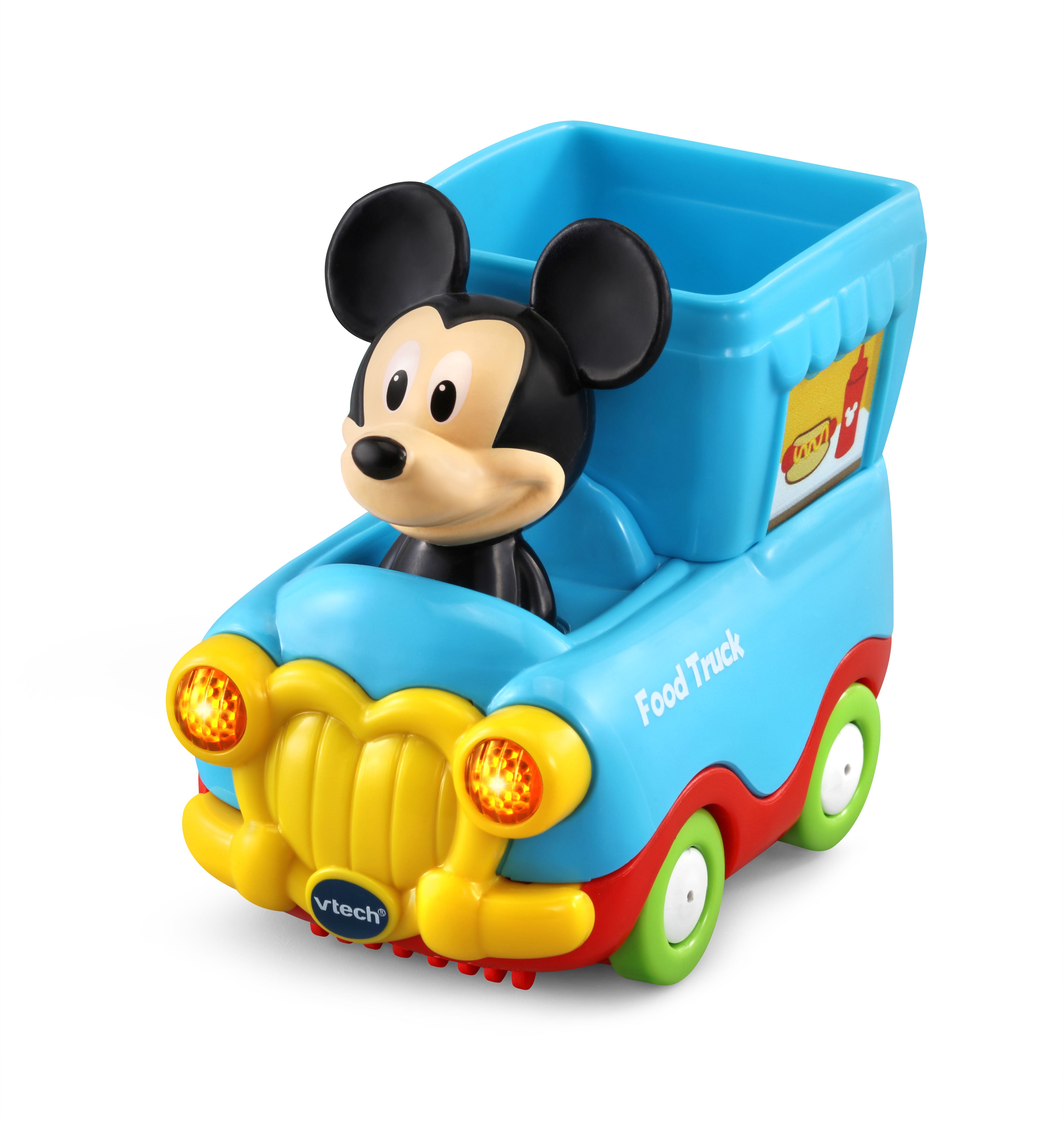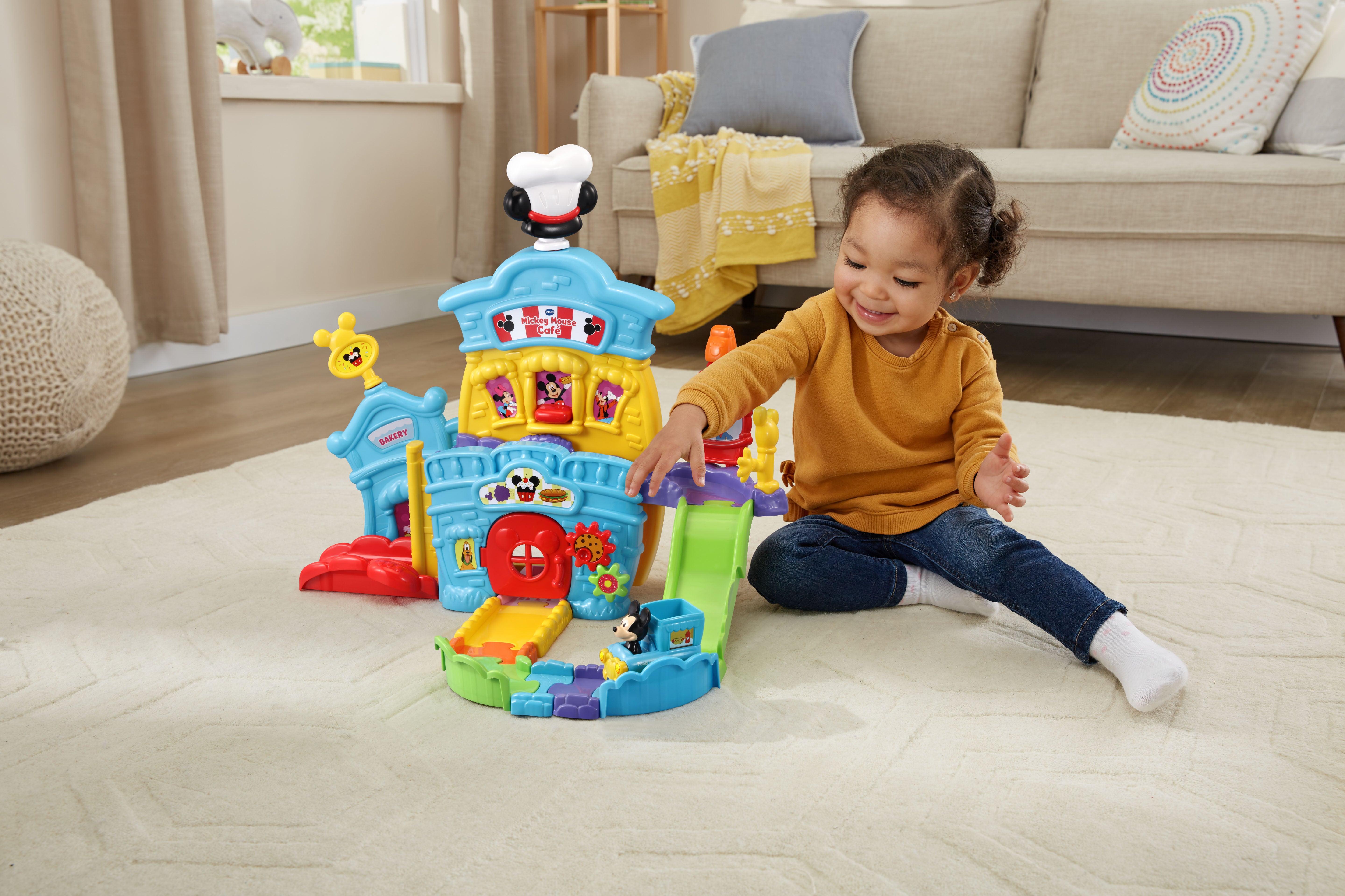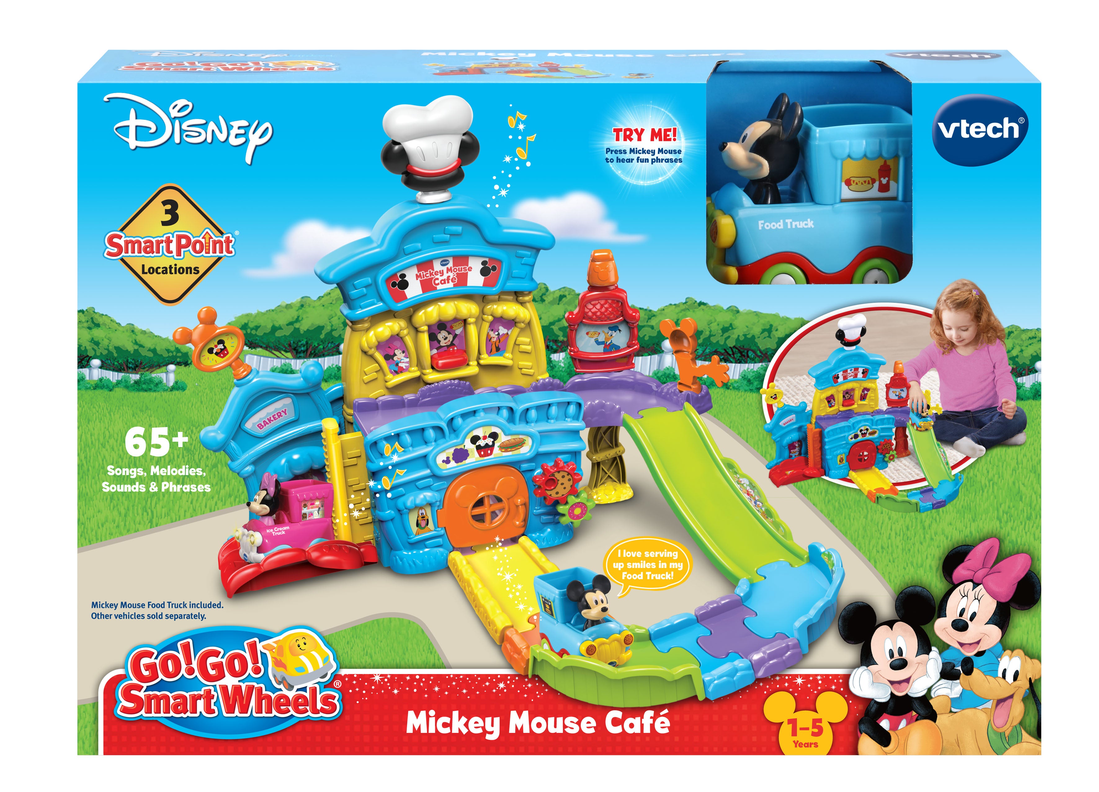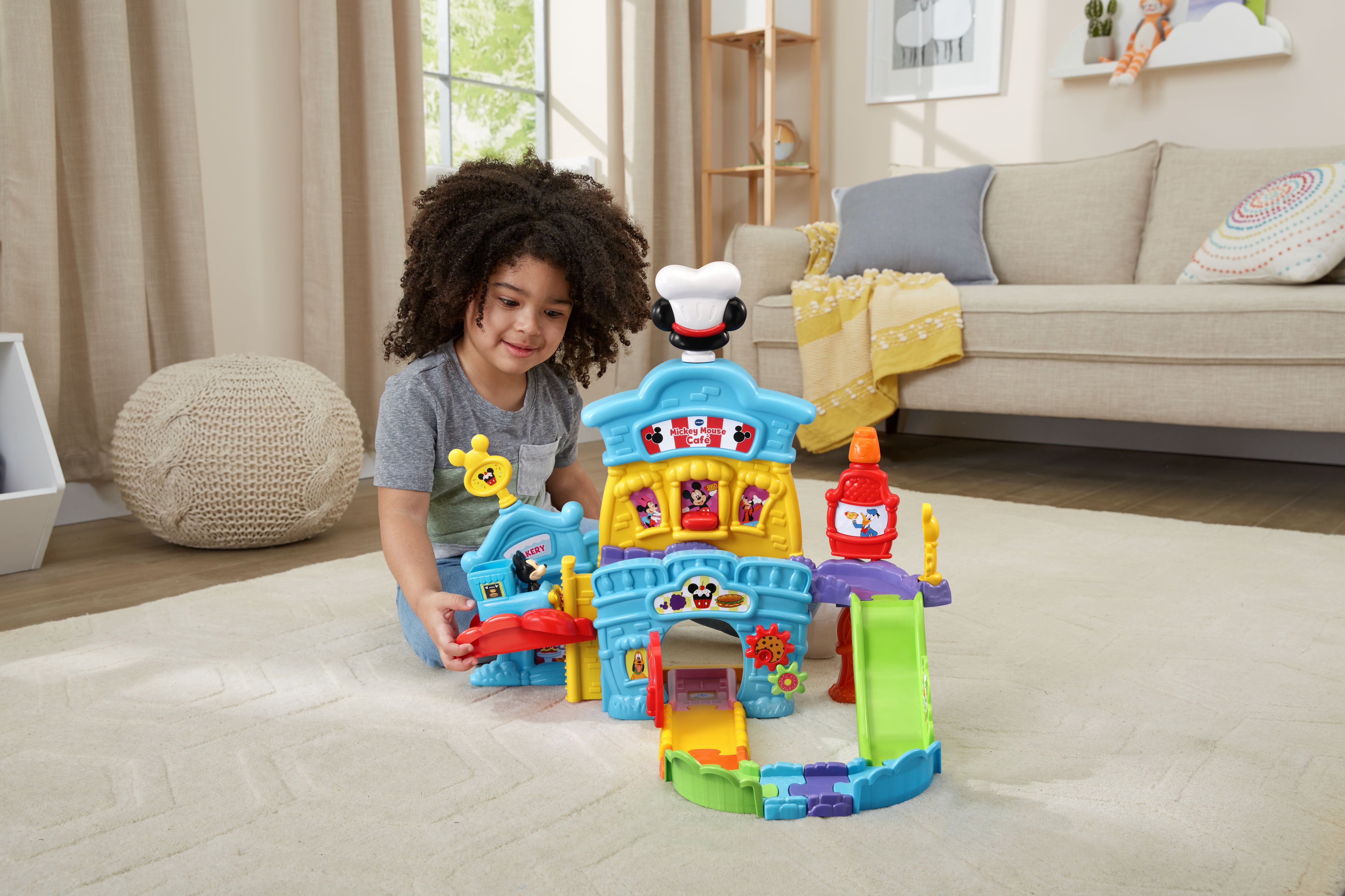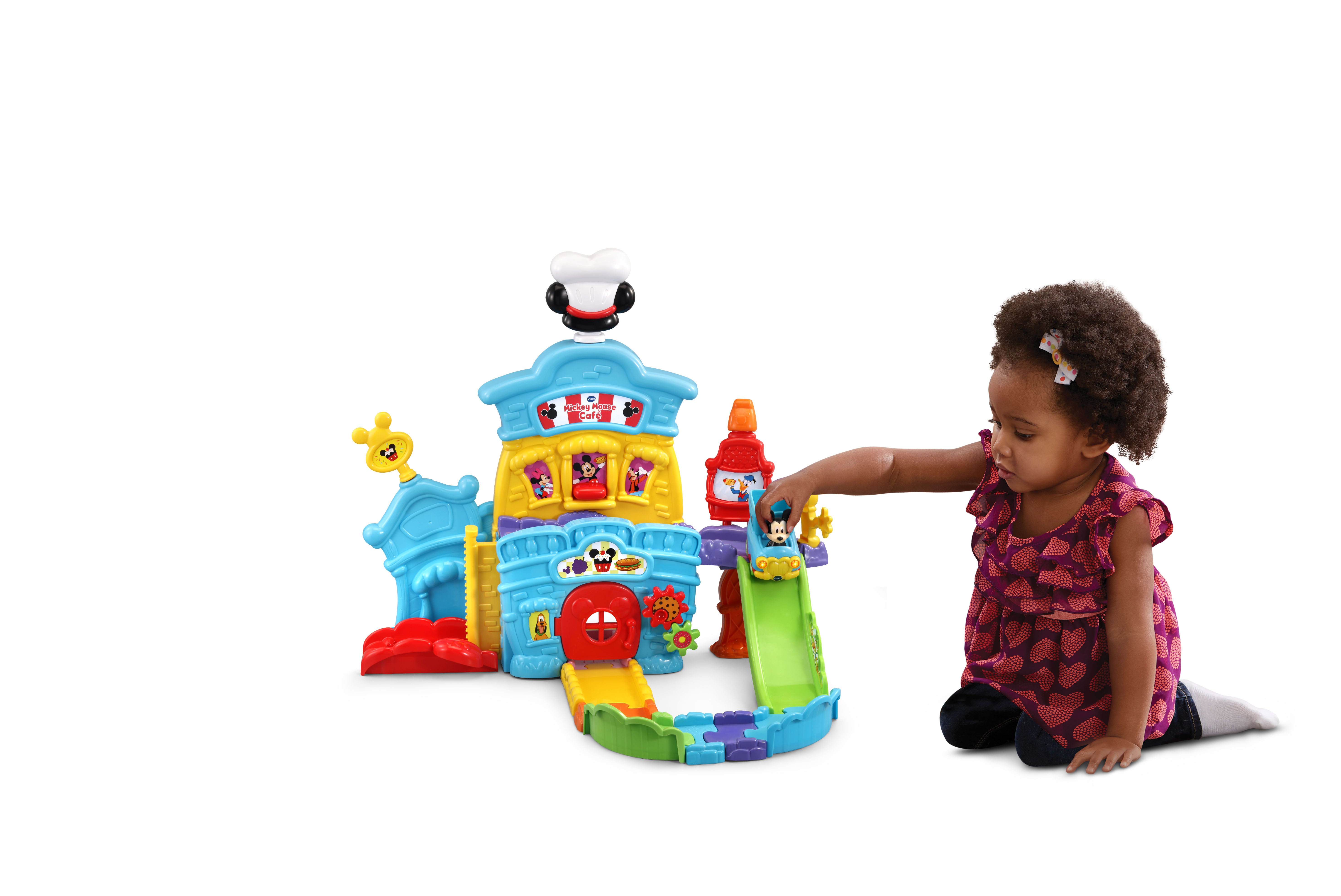 The VTech Go! Go! Smart Wheels Mickey Mouse Café brings imaginative, café-themed fun to little learners. Kids can move the Mickey Mouse Food Truck along tracks, open and close the window and door, and raise or lower the elevator—all while building motor skills. Through playful sounds, phrases, and character interactions, this set teaches the letter F, and adds extra excitement with three sing-along songs and six melodies. Compatible with all Go! Go! Smart Wheels / Toot-Toot Drivers playsets (sold separately).