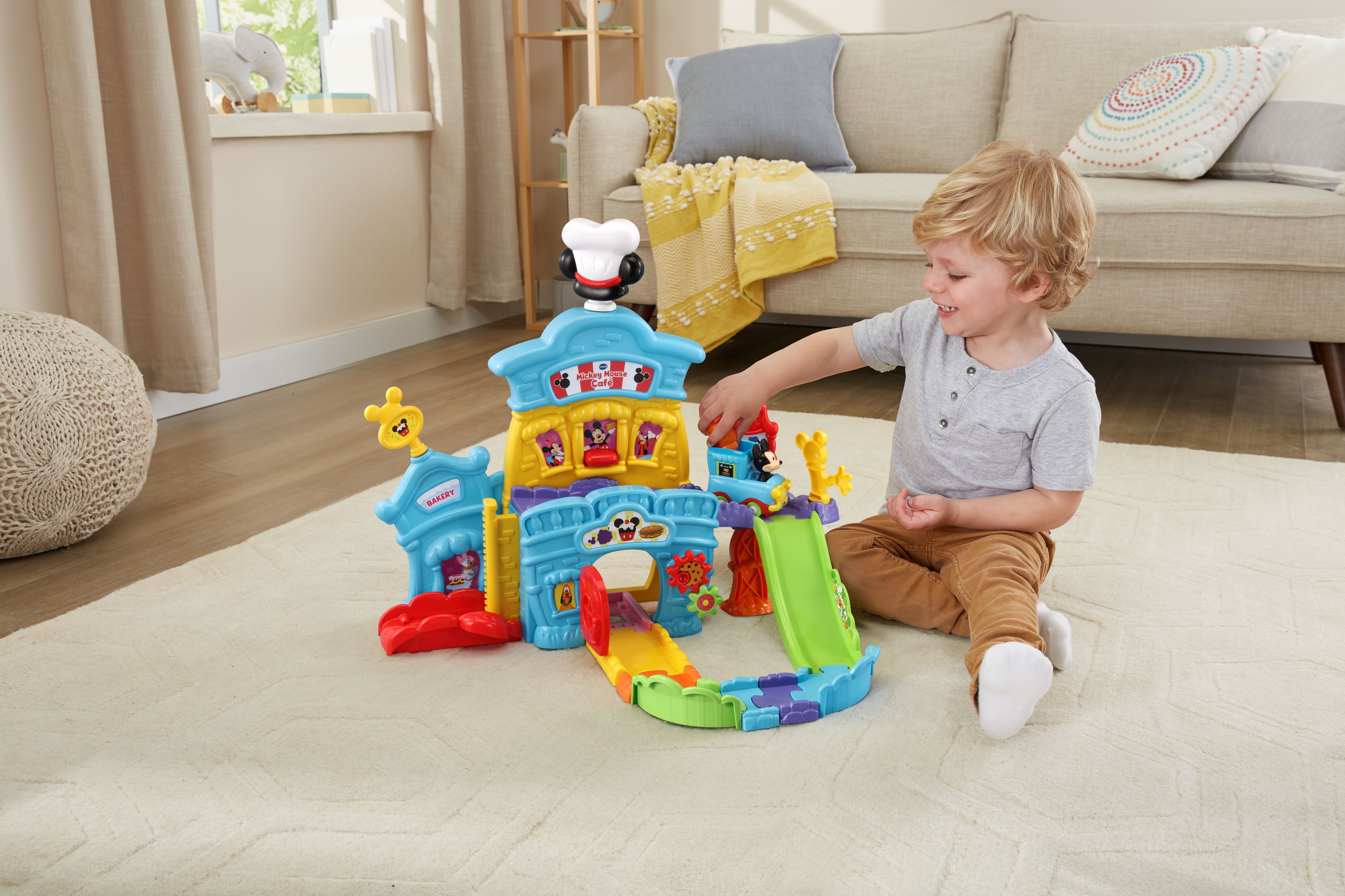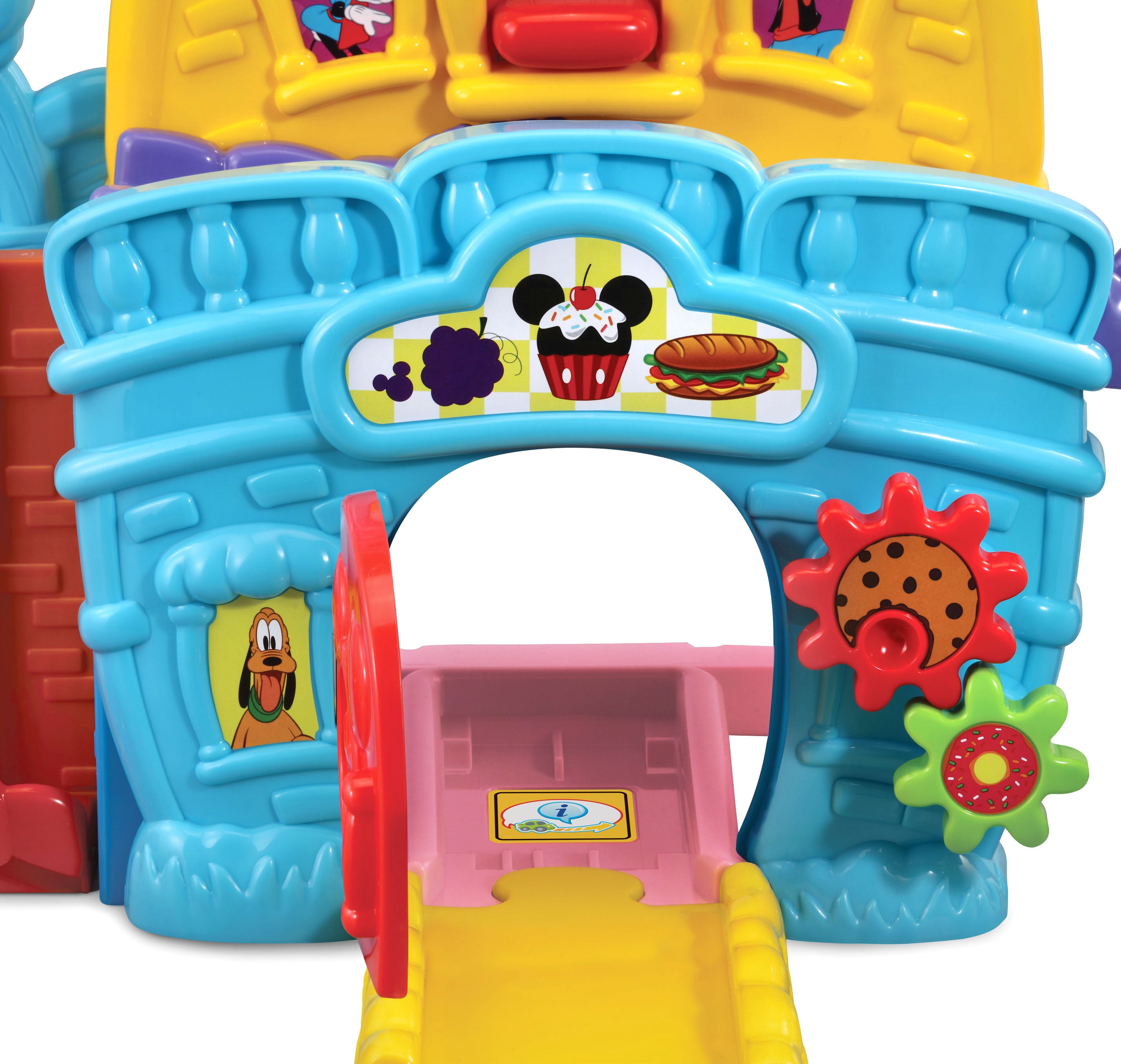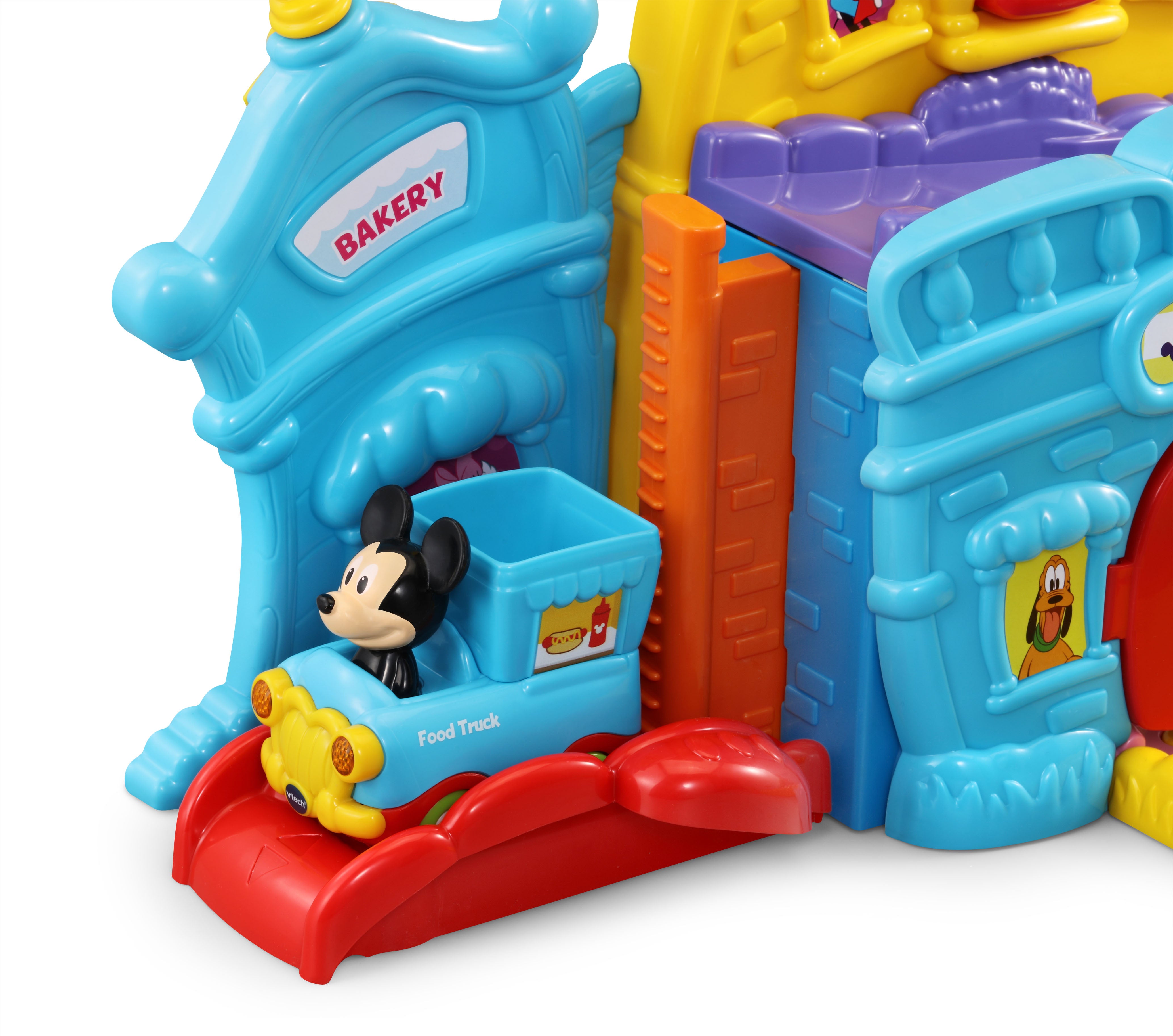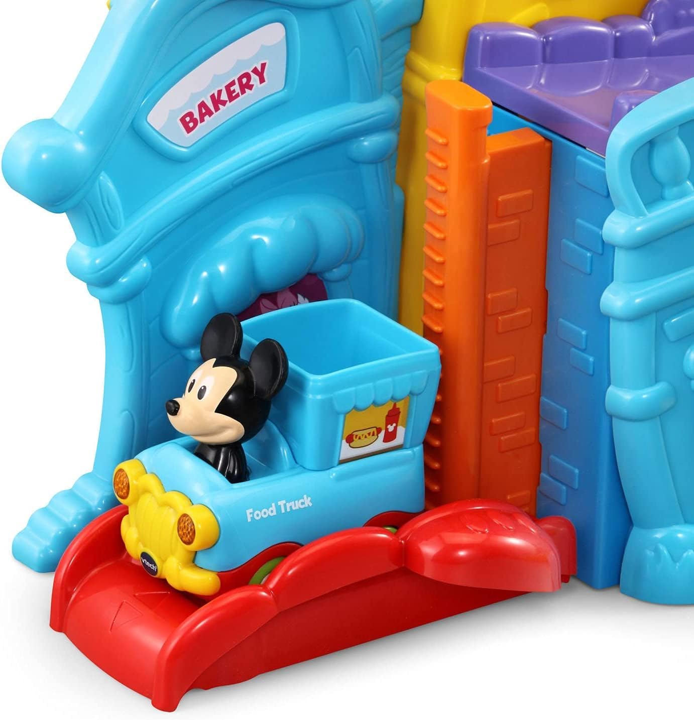 The VTech Go! Go! Smart Wheels Mickey Mouse Café brings imaginative, café-themed fun to little learners. Kids can move the Mickey Mouse Food Truck along tracks, open and close the window and door, and raise or lower the elevator—all while building motor skills. Through playful sounds, phrases, and character interactions, this set teaches the letter F, and adds extra excitement with three sing-along songs and six melodies. Compatible with all Go! Go! Smart Wheels / Toot-Toot Drivers playsets (sold separately).