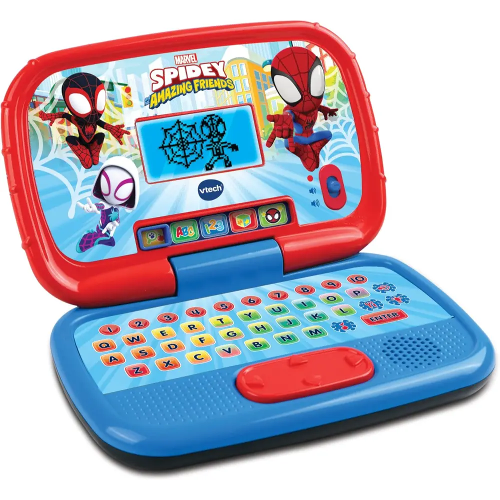 Join Spidey, Ghost Spider, and Spin to help them save the city while discovering letters, sounds, words, numbers, and counting with the VTech Spidey Learning Laptop. Featuring lively animations, fun sound effects, dynamic music, and a membrane QWERTY keyboard, children can explore early computer skills through independent play. The switchable blue backlight adds a cool glow to the screen, enhancing the experience. With 15 built-in activities, kids can enjoy logic, memory, and creative games as Spidey and friends guide them on their learning adventure.