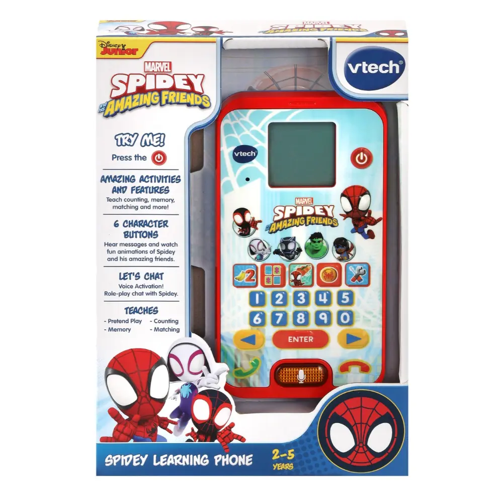 Join Spidey and his team with the Spidey Learning Phone, designed to inspire imaginative play and early learning! Featuring voice-activated play, your child can pretend to call Spidey and enjoy four exciting learning games that build skills in numbers, counting, memory, and matching. Receive fun virtual voice messages from Spidey and discover interesting facts about his friends. Personalize the phone experience by choosing from five ringtones and adjusting screen contrast and background music. This interactive toy combines fun and education, perfect for little superheroes in training!
