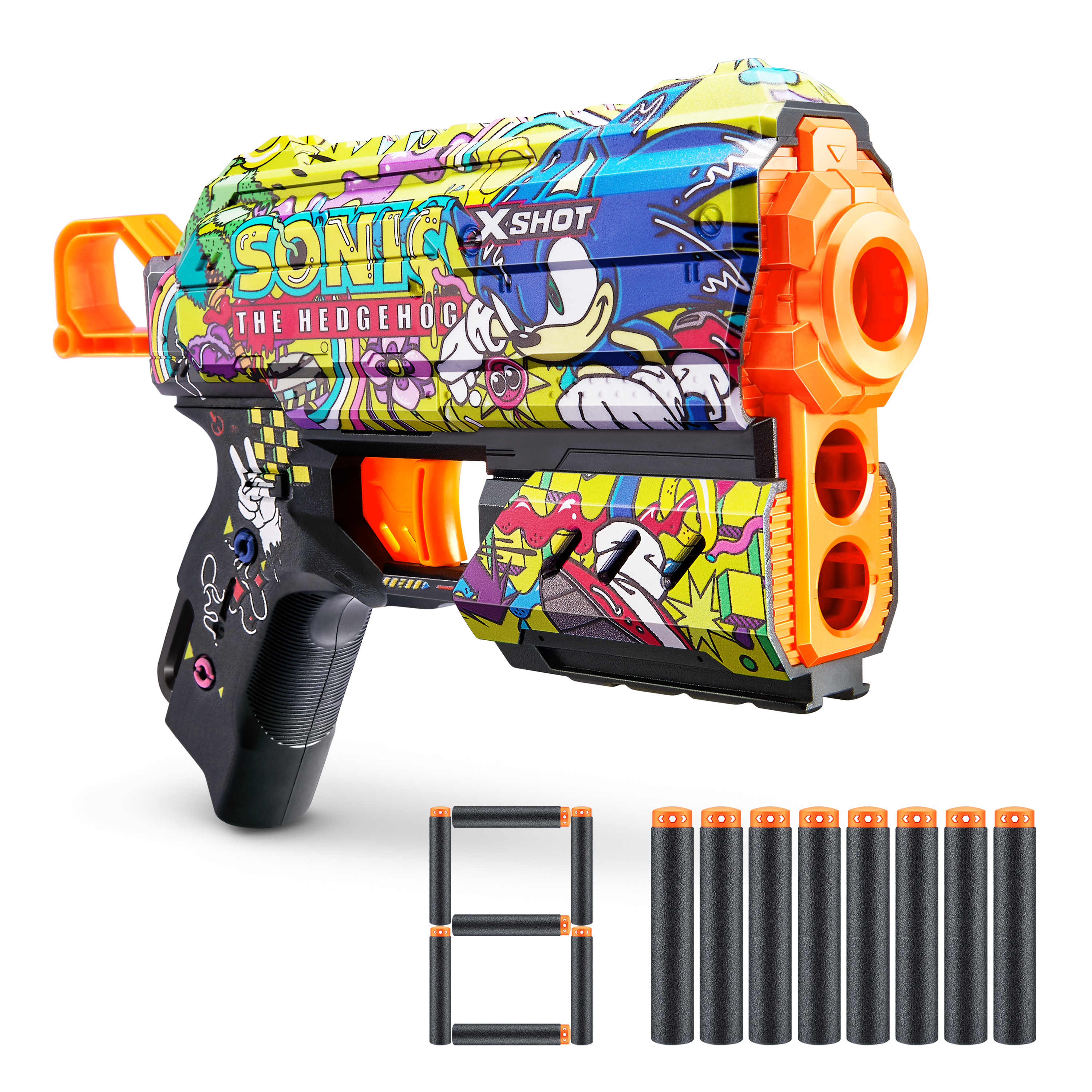 Skin your blaster with the super sonic speed of Sonic the Hedgehog! Join Sonic, Tails, and Knuckles in battle with the X-Shot Skins Flux featuring the iconic Sonic design. This blaster offers a single dart capacity with an easy reload mechanism and two additional front dart storage slots, keeping you ready for action. Shoot targets up to 27 meters (90 feet) away with powerful recoil after every blast. Equipped with Air Pocket Technology darts, the Flux delivers faster, further, and more accurate shots. Choose different, choose X-Shot Skins!