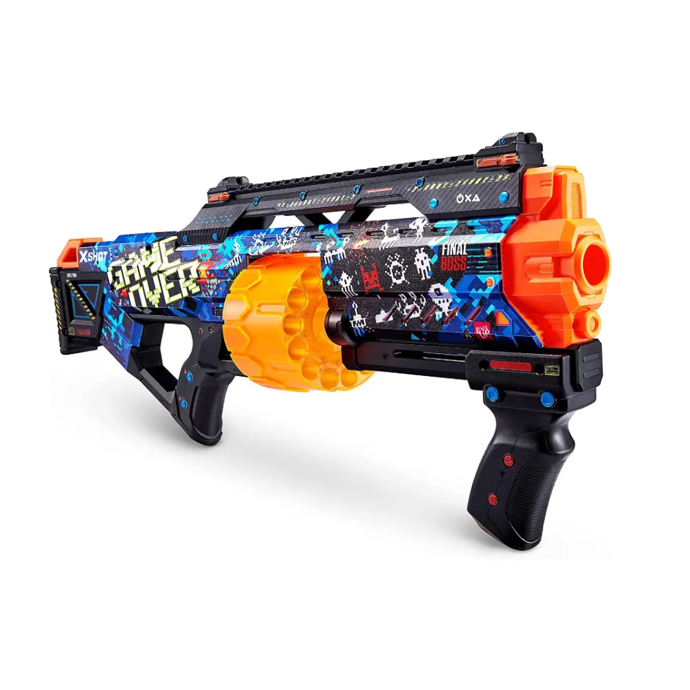 The X-Shot Skins Last Stand blaster takes your blaster battles to the next level by bringing in-game skin customization into the real world with 4 unique designs to choose from and collect. As the largest blaster in the X-Shot Skins range, it delivers powerful performance with a 16-dart capacity auto-rotating barrel, allowing you to unleash darts rapidly with its easy-to-prime and slam-fire mechanism. Capable of hitting targets up to 27m (90ft) away, it features a tactical grip and rail for accessories to level up your gameplay. Equipped with Air Pocket Technology darts, this blaster ensures faster, farther, and more accurate shots for maximum battlefield dominance.